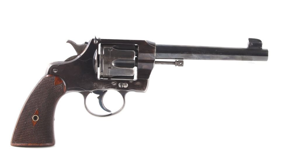 they were intended as either target arms or as a high quality above-the-standard issue revolver for police or military officers who were then carrying fixed sighted .38 Colt caliber revolvers. This model is further distinguished by having finely checkered walnut grips (the military model had smooth walnut). Additionally, the back strap and trigger face are beautifully checkered. The frame retains most of the early high polish Colt blue of that era and the action was hand fitted and polished to perfection. Fine bright bore and the cylinder also retains excellent blue. The grips fit perfectly and show only light wear to the checkering. The barrel only appears to have had correct and matching restorative blue added and retains all the very early first model “OFFICERS MODEL COLT D.A.38” (for Double Action) marking as well as the Colt address and patent markings on the barrel top with the correct last
