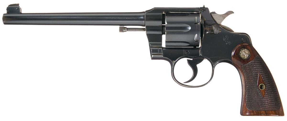 Manufactured in 1918. The top of the barrel is marked with the two line address/1884, 1900 and 1905 patent dates, the left side is marked OFFICERS MODEL 38" flanked by Maltese crosses and the left side plate is marked with the rampant Colt. Elevation adjustable front and windage adjustable rear sights, checkered trigger, hammer and backstrap and fitted with checkered walnut grips with silver Colt medallions.