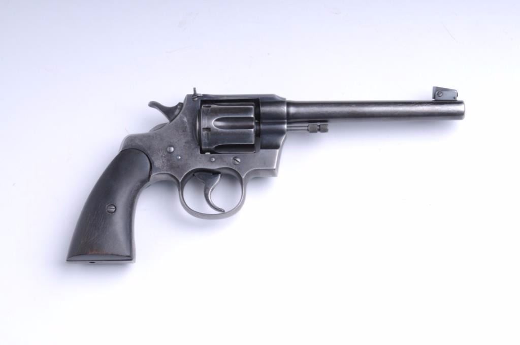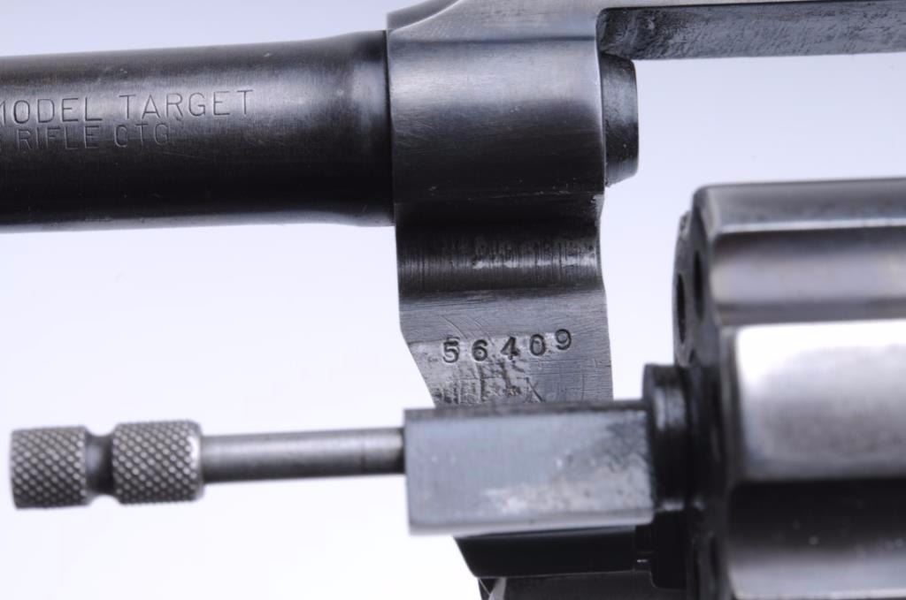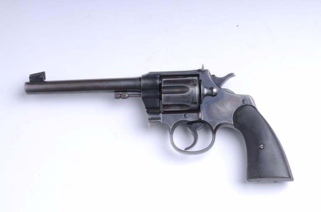 Colt Officers Model Flat Top Target in .22 L.R. caliber showing a blue finish, wood grips, S/N 2256409. This revolver remains ingood condition showing considerable blue reaming starting to go to patina. The replaced grips are in good condition showing some dings and scratches from carry and use. The bore is good and the action is good.(Modern/PPT) Est.: $250-$500