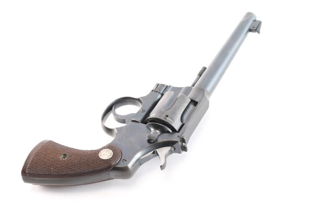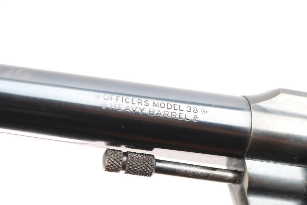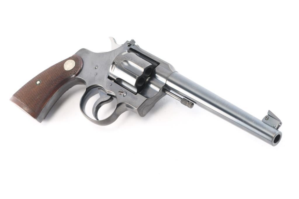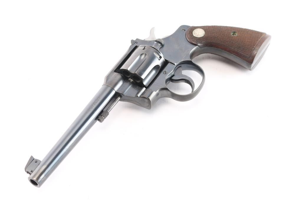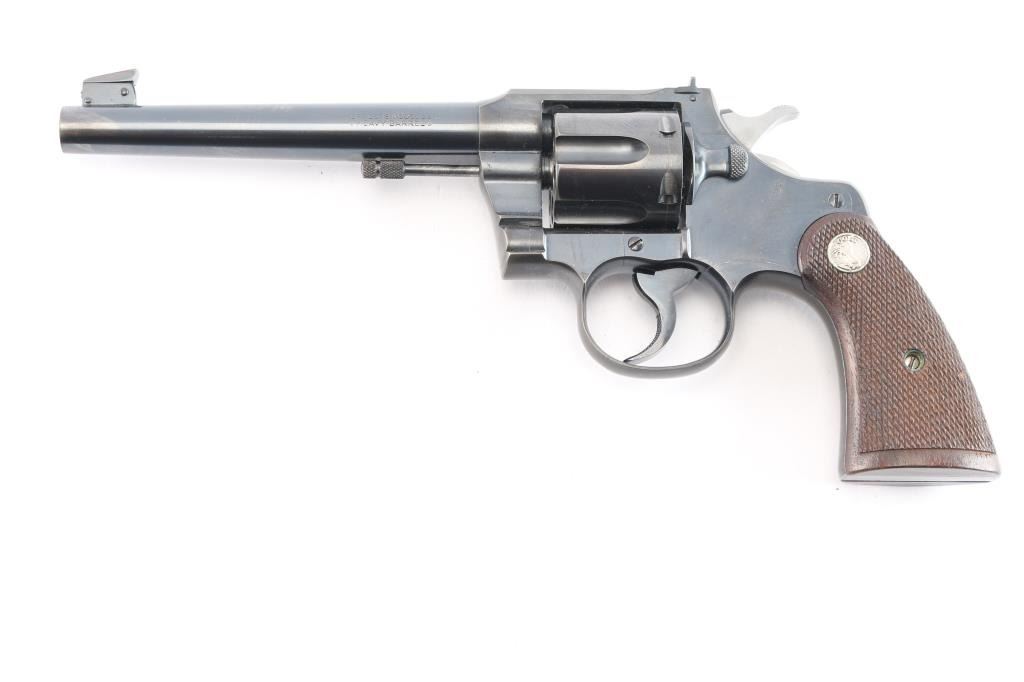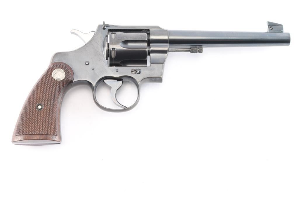 SN: 578377. 'Heavy Barrel' target revolver built on the Official Police frame, circa 1950. Features blued finish, hammer has polished sides, checkered walnut grips with Colt medallions, 6" heavy barrel, adjustable sights with pinned Partridge front & notch rear, flat top frame, 6 shot fluted cylinder., knurled trigger. Bore is excellent/bright. Retains about 97% blue, original with crisp markings, showing slight edge losses. Action is smooth with tight lock-up. Grips are excellent.