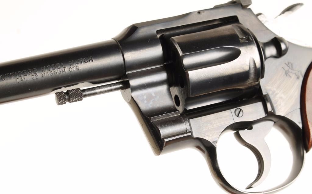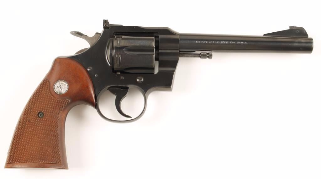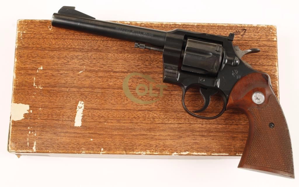 Blued six shot double action revolver chambered in .22 Magnum, circa 1960. Features a full Colt Blue finish, 6" bull barrel, adjustable rear sight, undercut front sight with removable blade, checkered wide hammer spur, serrated trigger & backstrap, fluted cylinder and checkered medallion walnut target grips. Includes an original Colt "woodgrain" cardboard box with cleaning brush and brown paper. Finish shows very little handling wear, a faint dragline, slight muzzle wear and a few areas of small losses of bluing on cylinder and on frame near hammer. Overall revolver retains 94%+ original finish. Bore in immaculate, action is smooth and grips are very fine. Condition is near excellent in box. ***Modern Firearm***