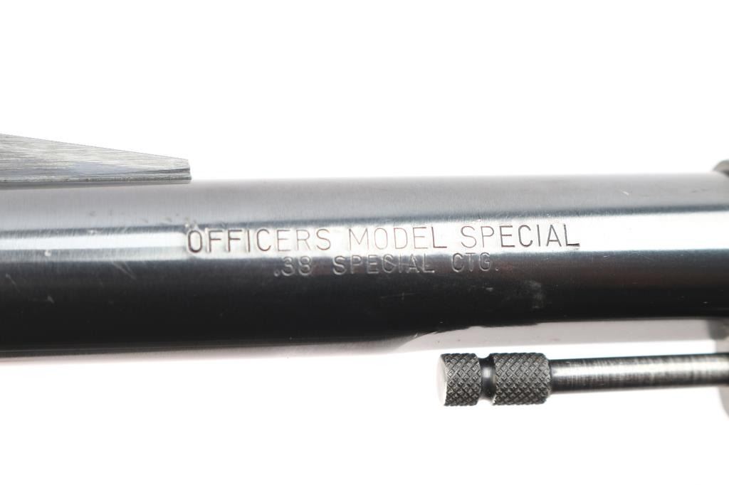 Vintage Colt double-action revolver, manufactured circa 1950. Features a blue finish, polished hammer sides, 6 round fluted swing out cylinder, 6" barrel, pinned blade front sight mounted on a serrated ramp, adjustable square notch rear sight, flat top frame, serrated hammer spur and trigger, checkered wood target grips with thumb rest. Retains approximately 98% of finish with slight muzzle/edge wear, a few very minor scratches, action is crisp with tight lock-up, grips are fine and the bore is excellent/bright.