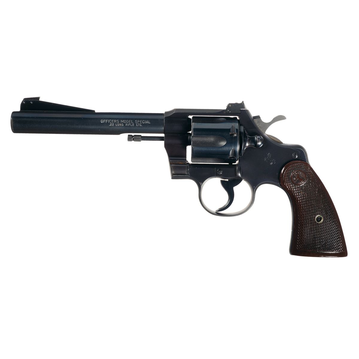 Introduced in 1953. Features standard barrel and frame markings, target sights, and fitted with brown checkered Rampant Colt grips.