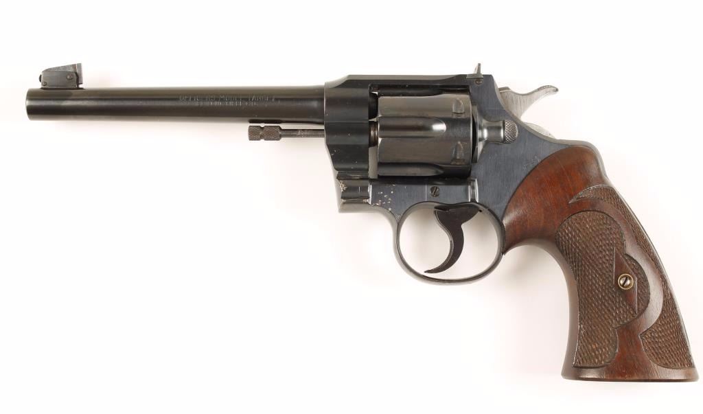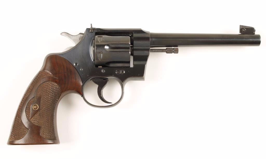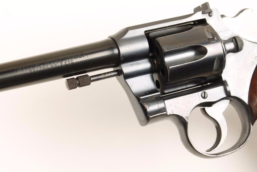 Blued double action six shot target revolver chambered in .22 Long Rifle, circa 1937. Features a full blued finish, 6" tapered barrel, undercut front sight with removable blade, adjustable rear sight, flat top frame, matte finished top strap, checkered hammer spur, trigger & backstrap, fluted cylinder and Checkered Roper "ribbon pattern" walnut grips. Finish show very little handling wear, a very faint drag line and a small cluster of losses to bluing on left side of the cylinder, frame and crane. Bore is immaculate, action and lock-up are very good and grips are near excellent. Condition is very good++. ***Modern Firearm***