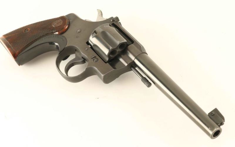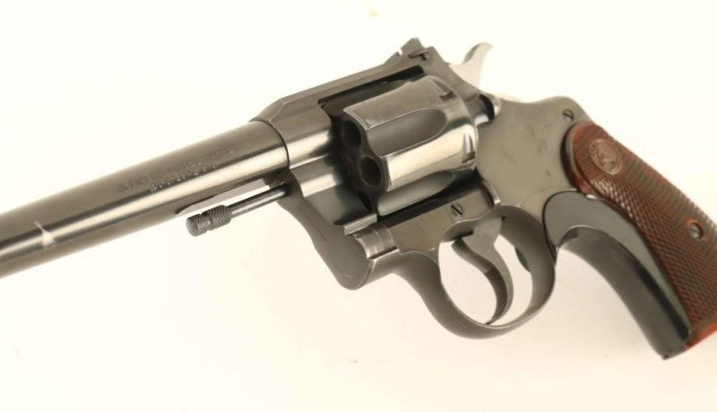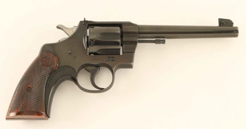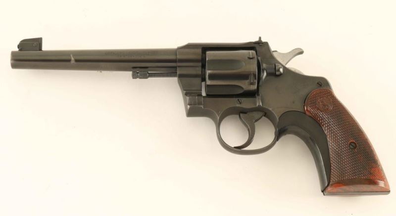 Post-war medium frame double action target revolver chambered in .38 Special, manufactured circa 1947. Features a blued finish, tapered 6" barrel, adjustable patridge front sight, drift adjustable square notch rear sight, flat top frame with matte finish top strap, knurled trigger, knurled hammer spur, fluted six-shot cylinder, non-shrouded ejector rod, serrated backstrap, Pachmayr grip adapter installed on the front strap and two-piece checkered Colt wood grips with Rampant Colt decor. Revolver exhibits approximately 90% of it's original blued finish showing scattered wear & handling marks and a small amount of light surface rust. Action is smooth with solid lock-up, the bore is pristine and the Colt wood grips are fine. Condition is near NRA Very Good. ***C&R Firearm***