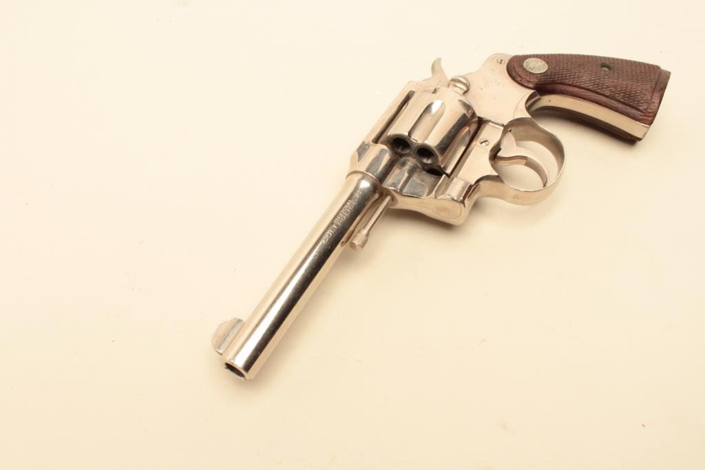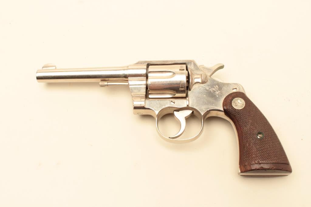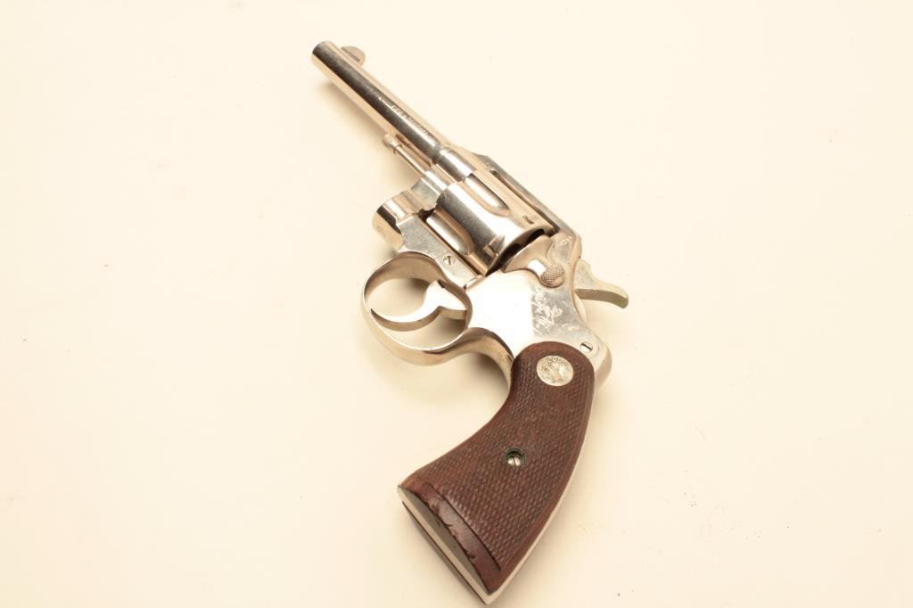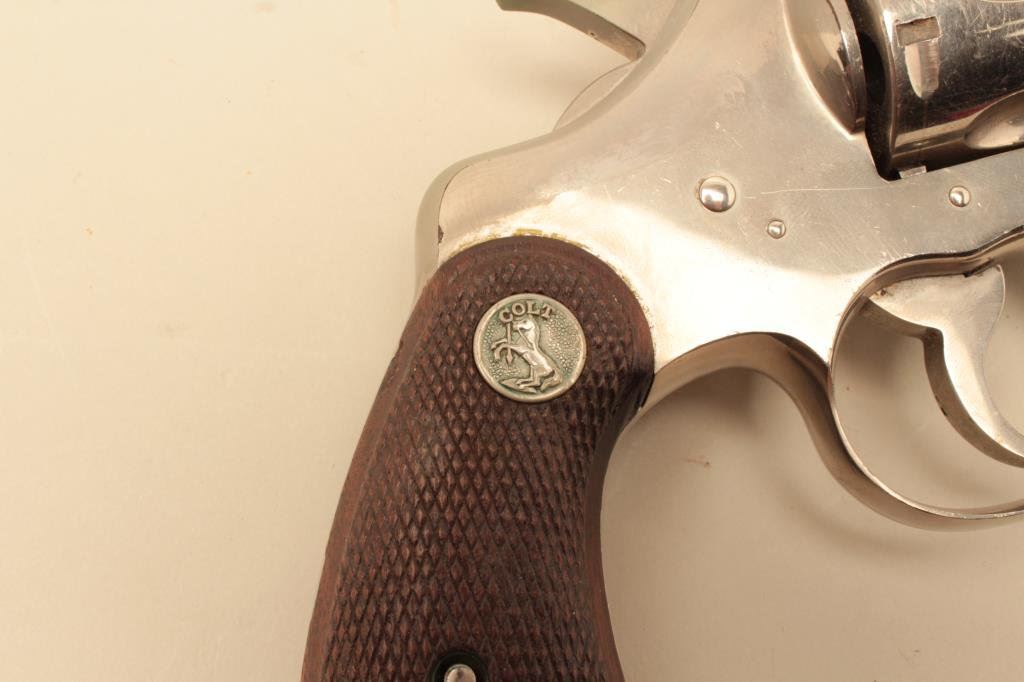 barrel, factory nickel, medallion wood grips, S/N 635076. Shows small British proofs and large “2” stamped on the bottom of the frame in front of the guard. Most likely lend lease for “Battle of Britain”. 90%-95% original nickel with dings, mars and scratches from carry and use. Good action and good bore. Dirty and needs cleaning. Minor storage scratches. (C&R/PPT) Est.: $300-$600
