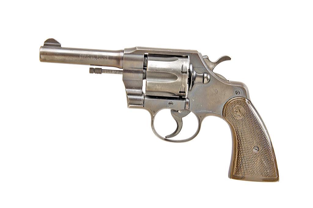 Colt Official Police Cal .38spec SN:824371 DA revolver, 4" barrel, blue finish, checkered Colt brown plastic grips. This gun is in overall very good condition showing considerable original blue finish with some holster wear and balance gone to a plumDA revolver, 4" barrel, blue finish, checkered Colt brown plastic grips. This gun is in overall very good condition showing considerable original blue finish with some holster wear and balance gone to a plum colored patina, very good bore,crisp action, sharp markings, overall good grips.