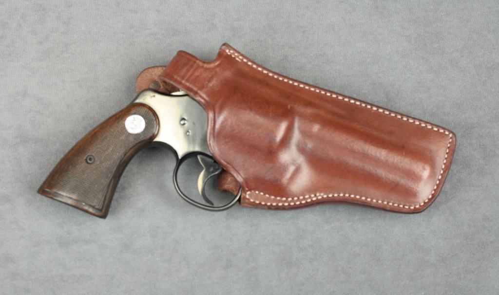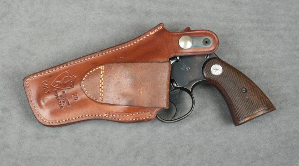 Colt Official Police DA revolver, .38 Special cal., 4” barrel, blue finish, checkered medallion wood grips, #917432. This gun is in overall fine condition showing approx. 70% original finish, fine bore, action, markingsand grips; accompanied by a Safariland brown leather holster. Est.: $250-$450.