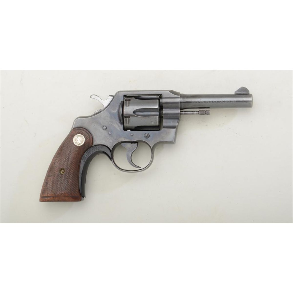 Colt Official Police DA revolver, .38 Special cal., 4” barrel, blue finish, checkered medallion wood grips with added grip shoe, #897435. This gun is in overall fine condition showing approx. 70% original bluefinish, very good to fine bore, crisp action, sharp markings, very good wood grips showing wear and some scattered nicks and mars from carry and storage. Est.: $100-$200.
