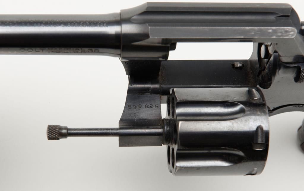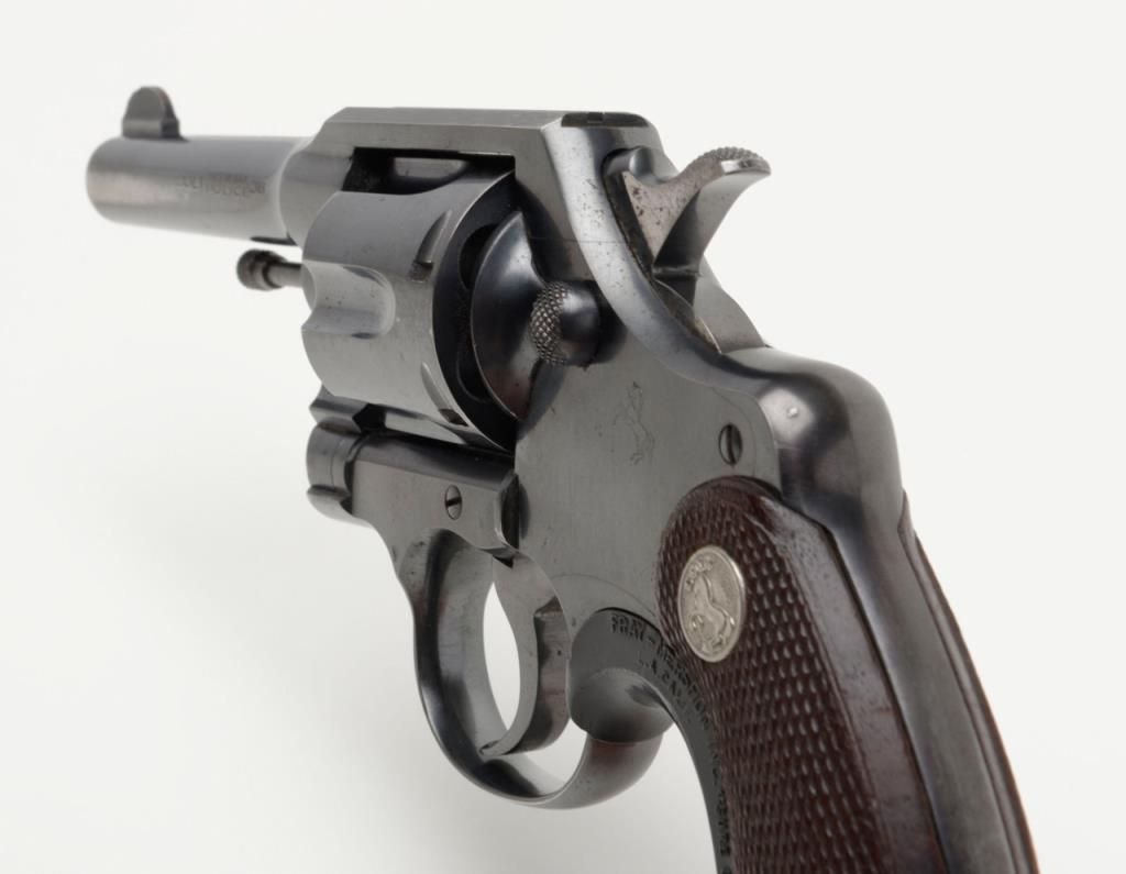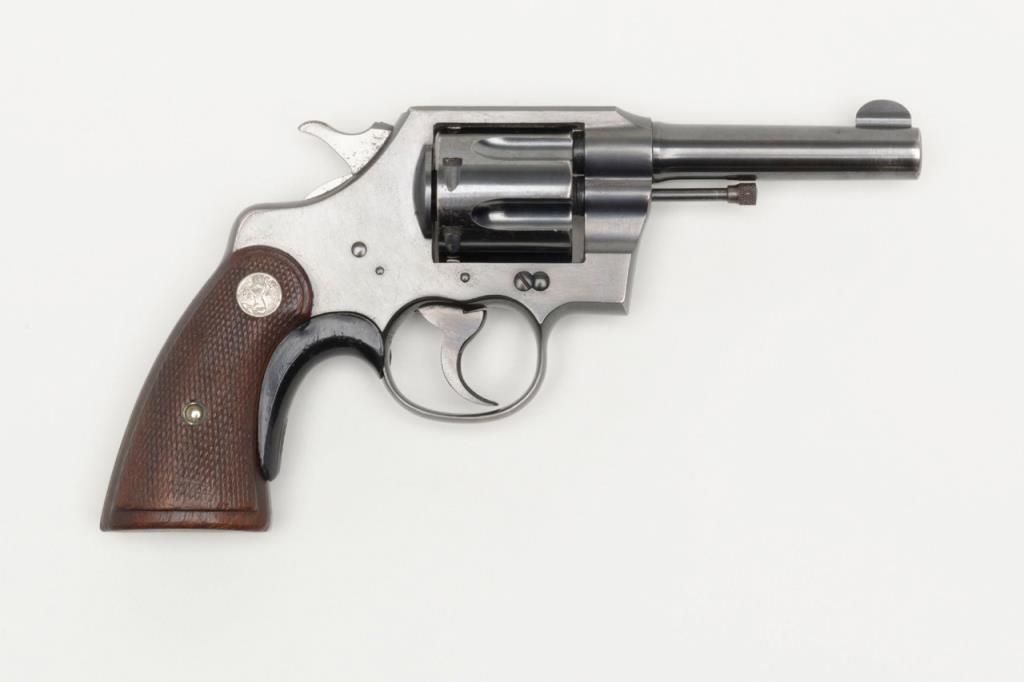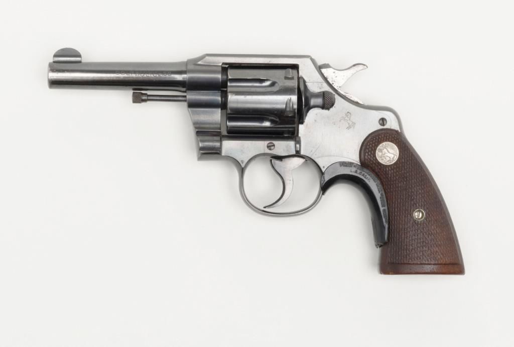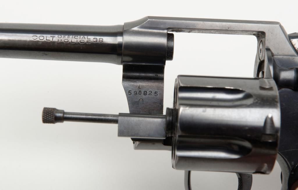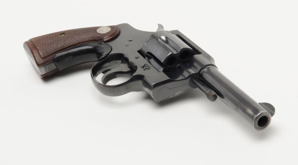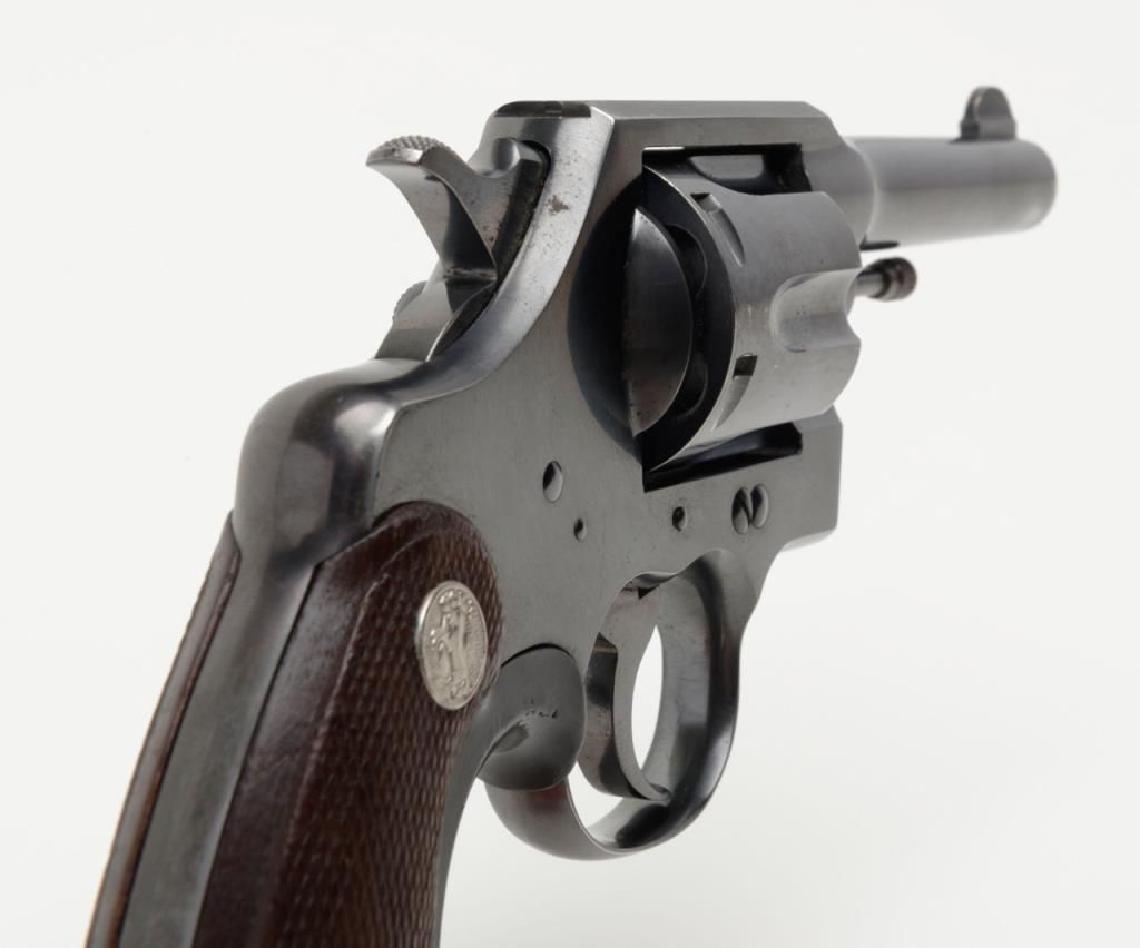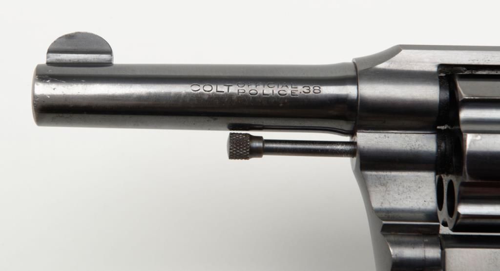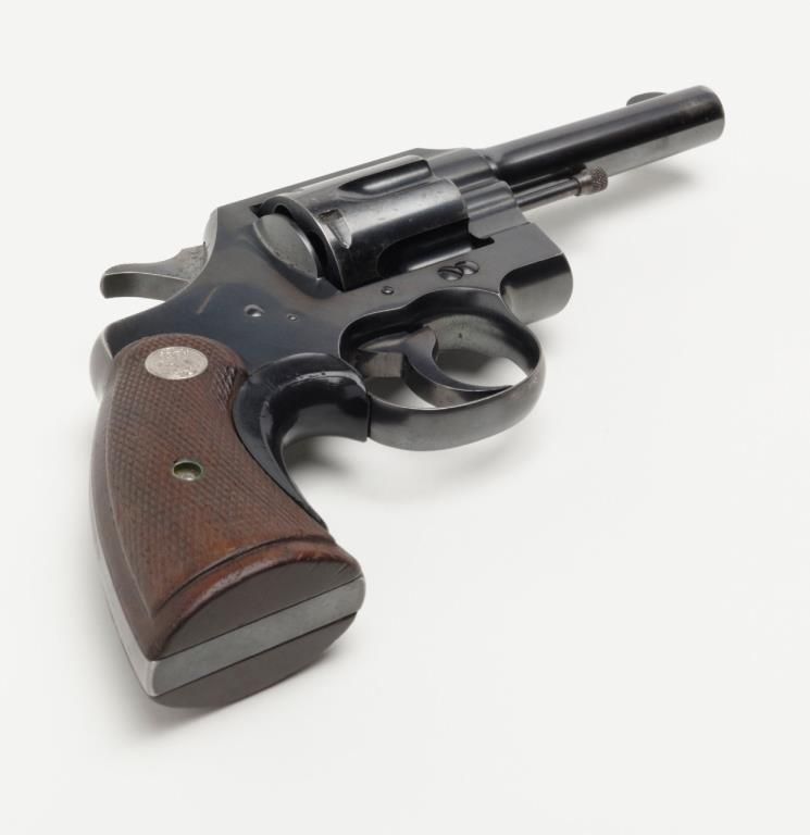 Colt Official Police DA revolver, .38 cal., 4” barrel, blue finish, checkered wood medallion grips, #590825 with added grip adapter, in overall very good to fine condition showing the majority of its original blue finish, just some high pointand muzzle wear, crisp action, sharp markings, very good + bore and grips; from an old California bay area estate. (C&R). Est.: $300-$600.