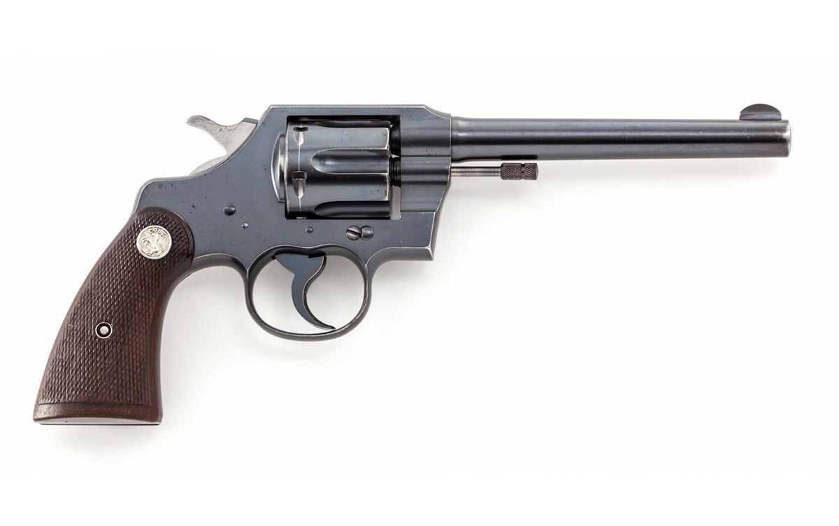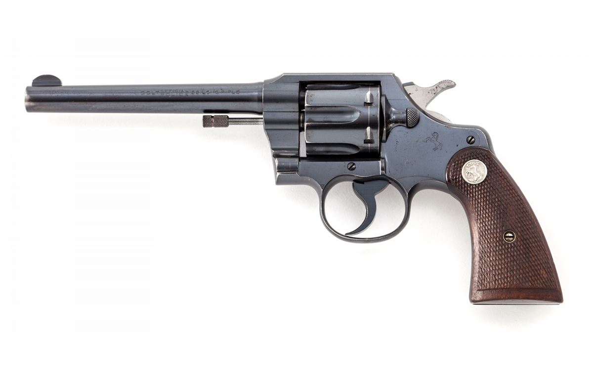 Colt Official Police Double Action Revolver, #10890, .22 LR cal., 6'' barrel, blue finish, factory checkered walnut grips with Colt medallions. Mfg'd 1935. Considered quite scarce in .22 LR. Condition is near excellent retaining approx. 96% original factory blue with wear at muzzle, forward edges of cylinder, and in actioning areas. Grips with moderate flattening. Action and bore are good. Est.: $800-$1,200. (C&R)