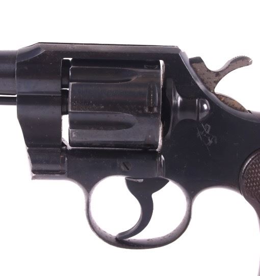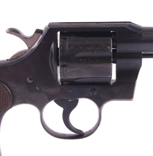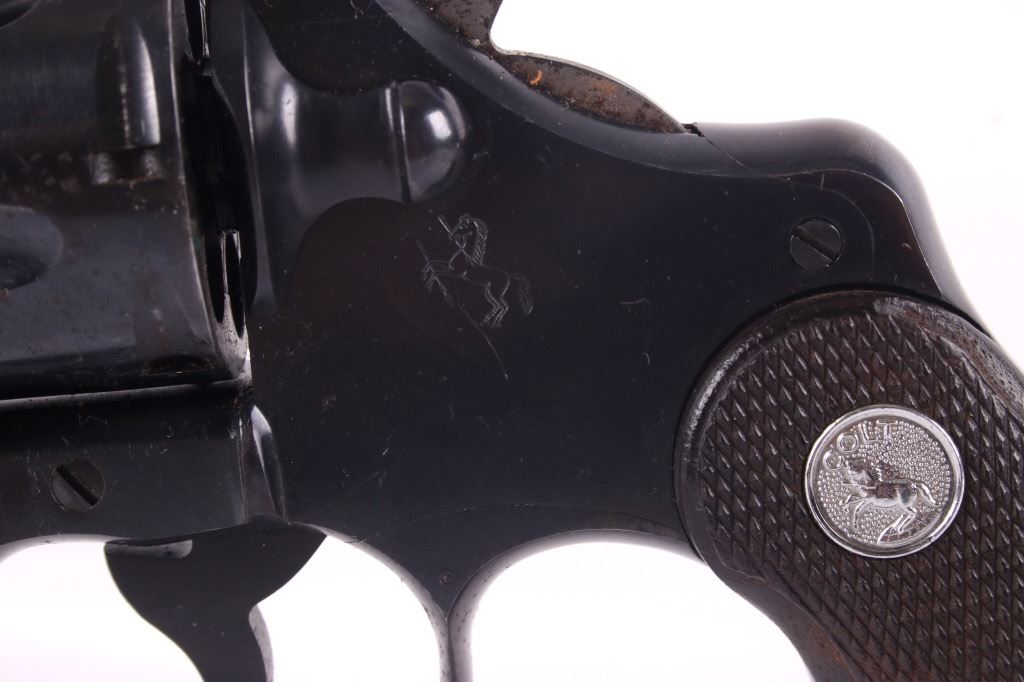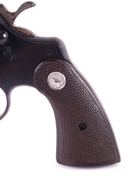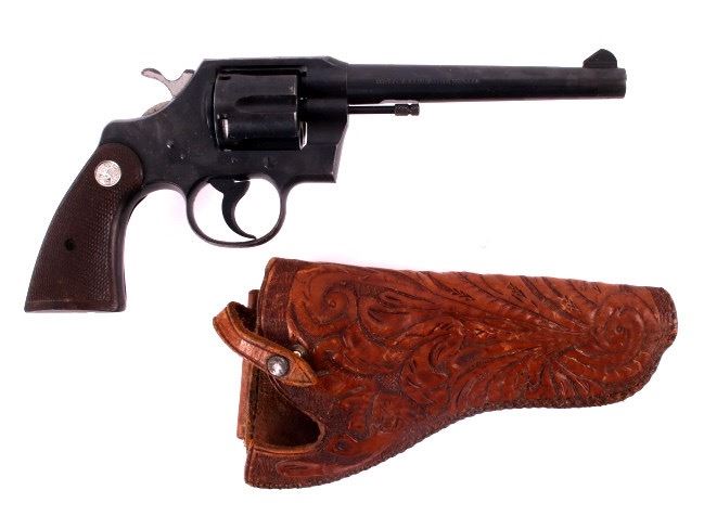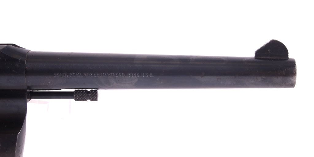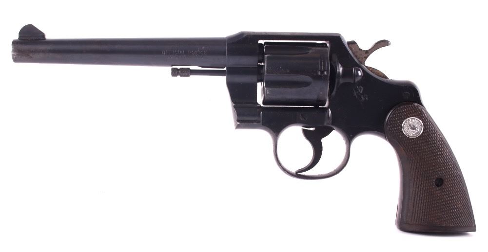 This is a Colt Official Police Model double action revolver chambered in the .38 special. The piece features a blue'd steel 6" barrel, frame and 6-shot cylinder. The right of the barrel is marked "Colt's Pt. F.A. Mfg. Co. Hartford, CT U.S.A." and the left side of the barrel is marked "Colt Official Police .38 Special CTG." The revolver has the original factory grips showing the rearing horse emblem on each side. The colt revolver is in good overall condition. This revolver has a manufacture date of 1966. Serial Number: 908913. This is a modern firearm and requires a FFL transfer or NICS background check.