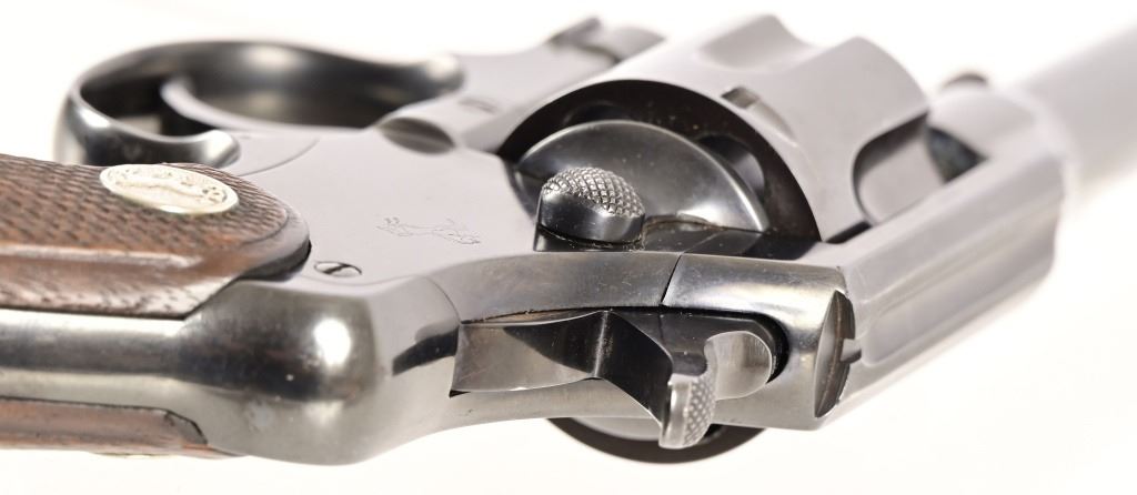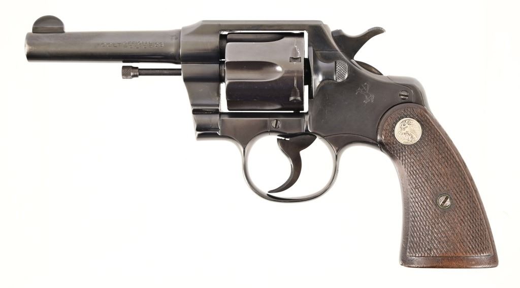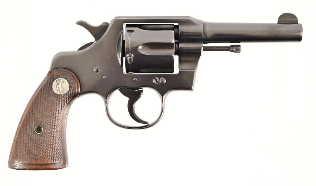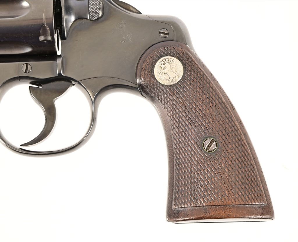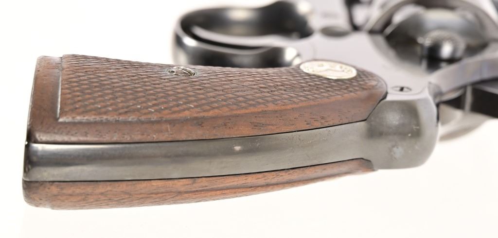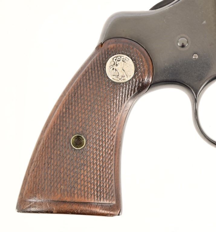 S/N 571830. Very good condition. Blued finish, checkered wood grips with Rampant Colt medallion, 4" barrel. Modern