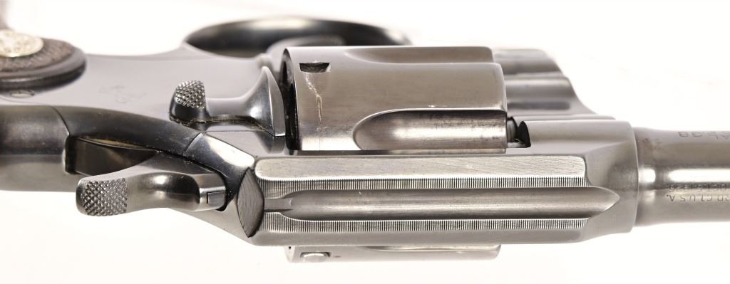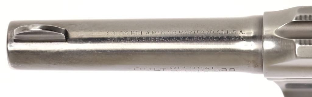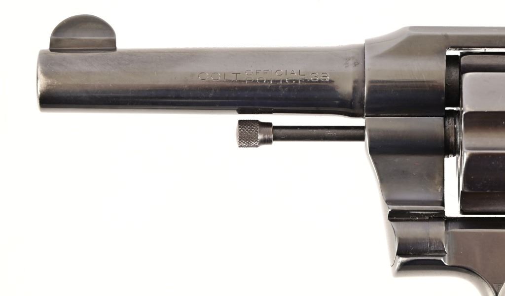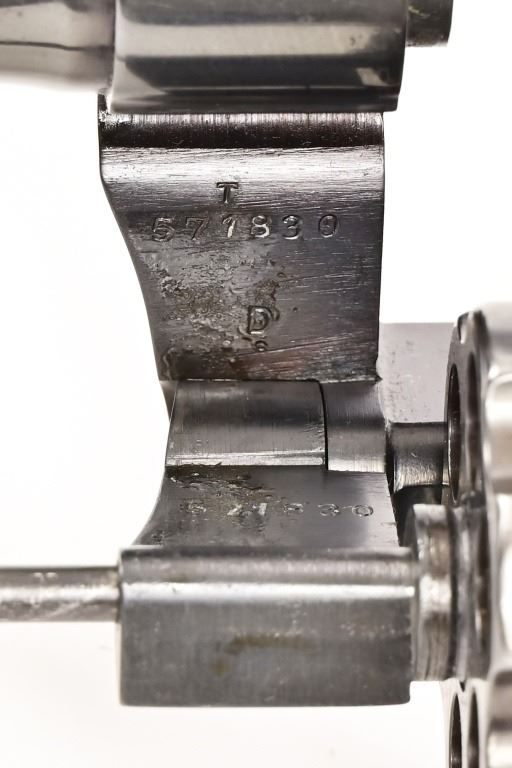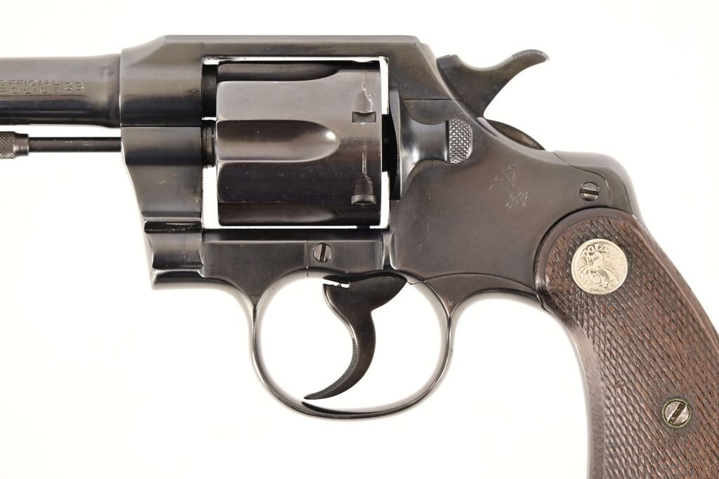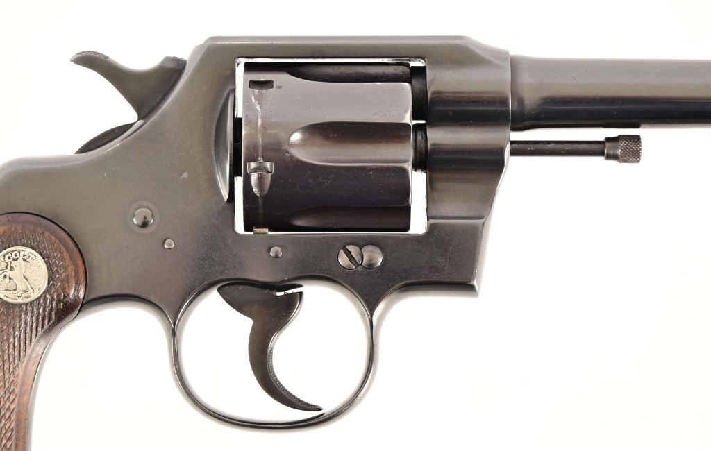 S/N 571830. Very good condition. Blued finish, checkered wood grips with Rampant Colt medallion, 4" barrel. Modern