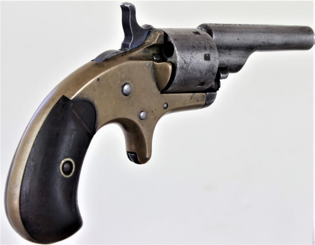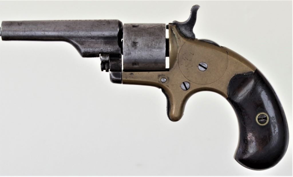 Colt Open Top .22 rim SN 4270 7 shot pocket revolver with 2 3/8" ejector less barrel blued finish and walnut grips. Good condition steel surfaces show silver gray, missing sight the brass frame uncleaned mustard color. Top of barrel with standard 2 linerevolver with 2 3/8" ejector less barrel blued finish and walnut grips. Good condition steel surfaces show silver gray, missing sight the brass frame uncleaned mustard color. Top of barrel with standard 2 line Hartford address, walnutgrips fine with traces of original finish. Mechanically tight with great action and good bore. Made from 1871-1877. magazine. De Accessioned from a state of AZ Museum. NO FFL / Antique. Est. 250-400
