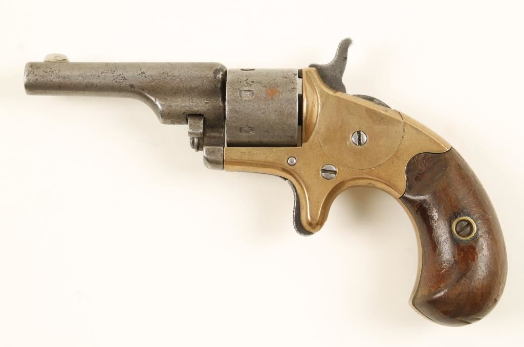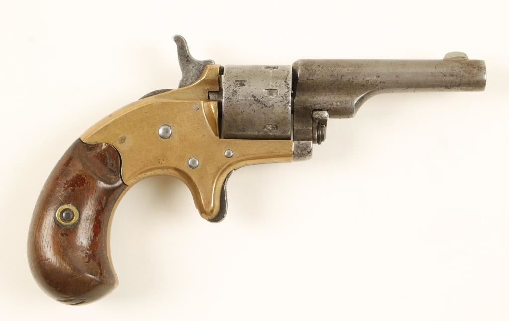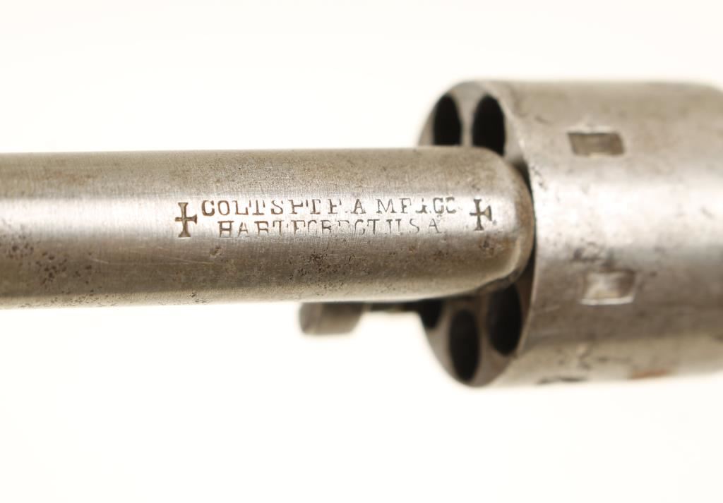 Made in 1874. Blued and brass 7-shot revolver with a 2-3/8" . Steel is worn to grey with rust stains and mild pitting. There are a few dings on the brass and the steel. Grips are a little loose and have dents, dings and scratches. Bore has some pitting but with good rifling. Chambers have pitting. Action works well with loose lock-up. Condition is good. *Antique Firearm*