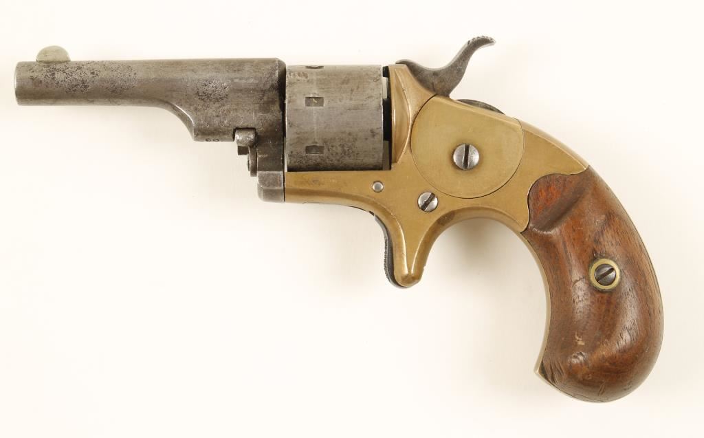 Made in 1875. Blued and brass 7-shot revolver with a 2-3/8" . Steel barrel is worn to grey with rust stains and moderate pitting. There are a few dings on the brass and the steel and a drag line. Grips have dents, dings and scratches. Bore has some pitting with light rifling. Chambers have pitting. Action works well with loose lock-up. Condition is good. *Antique Firearm*