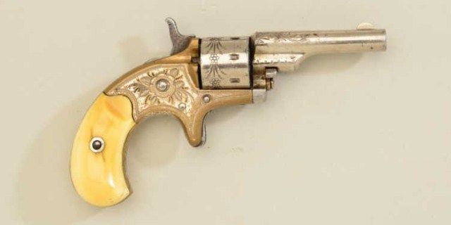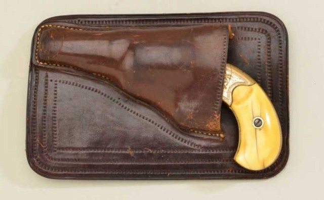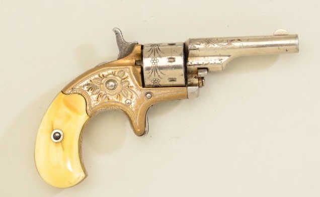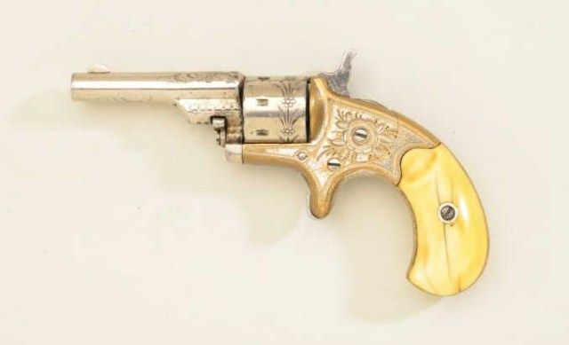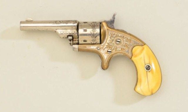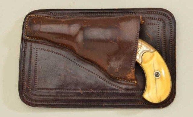Colt Open Top Pocket Model spur trigger revolver, period engraved, .22 cal., 2-3/8” barrel, nickel finish, period ivory grips, #26217 (barrel #24522). This gun is in overall very good condition showingconsiderable nickel finish on the barrel assembly and cylinder, approx. 30% thinning finish on brass frame, good action and markings, fair bore, beautiful mellow ivory grips with age cracking; high spur hammer;accompanied by an unmarked leather pocket holster in overall very good condition. Est.: $1,000-$1,800.