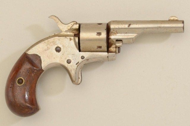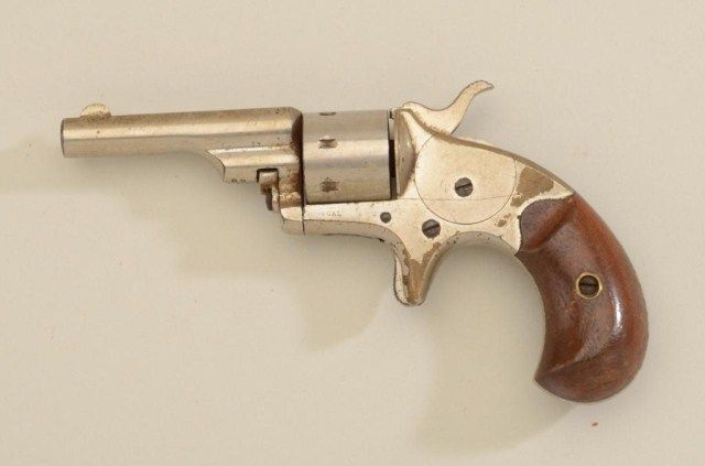 Colt Open Top spur trigger revolver, .22 cal., 2-1/2” barrel, nickel finish, wood grips, #83140. This gun is in overall good condition showing the majority of what appears to be an old quality re-nickelfinish, good action and markings, dark bore, good grips. Est.: $150-$300.