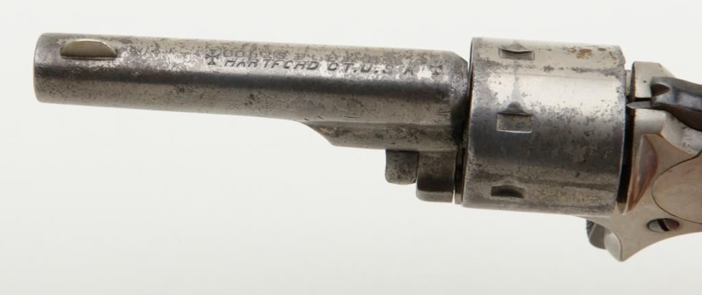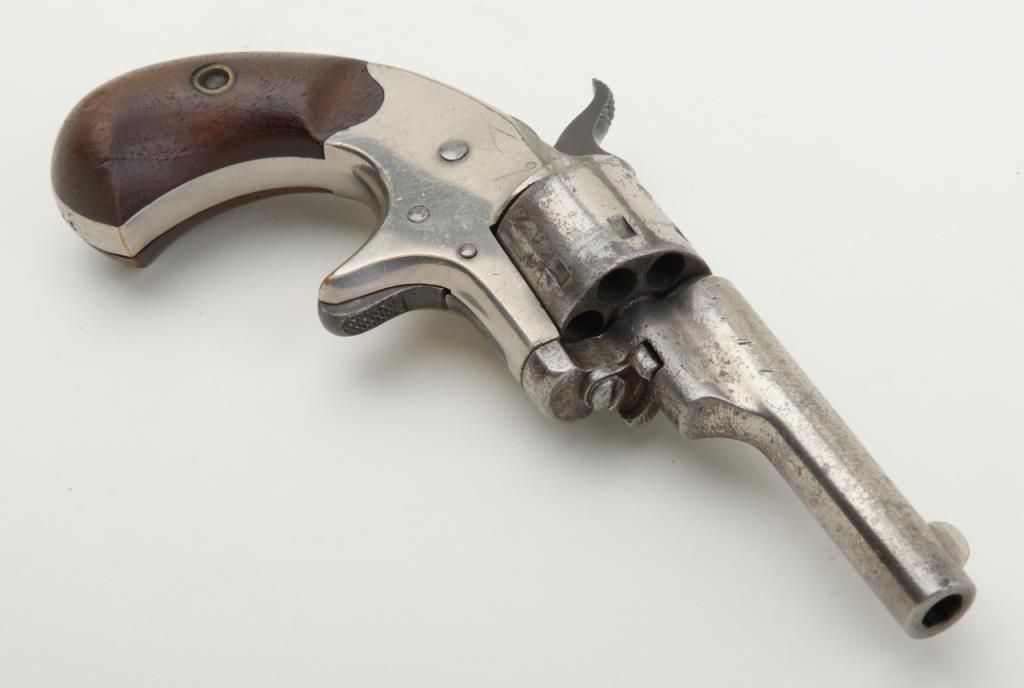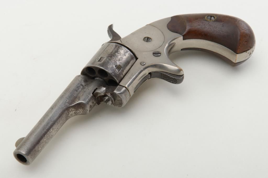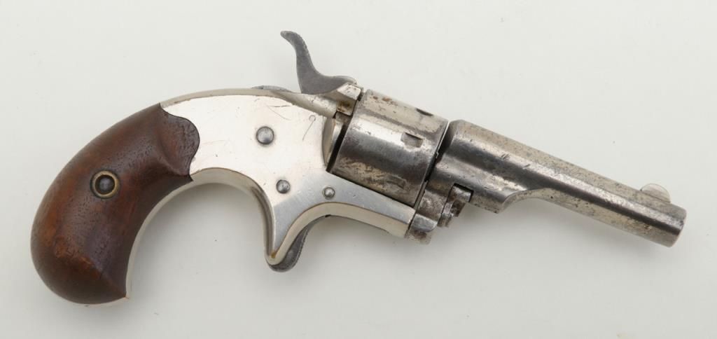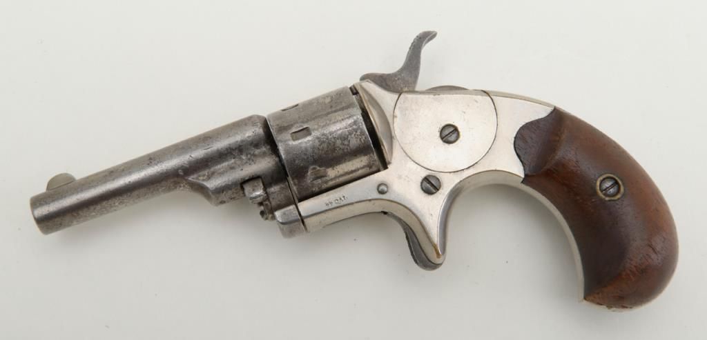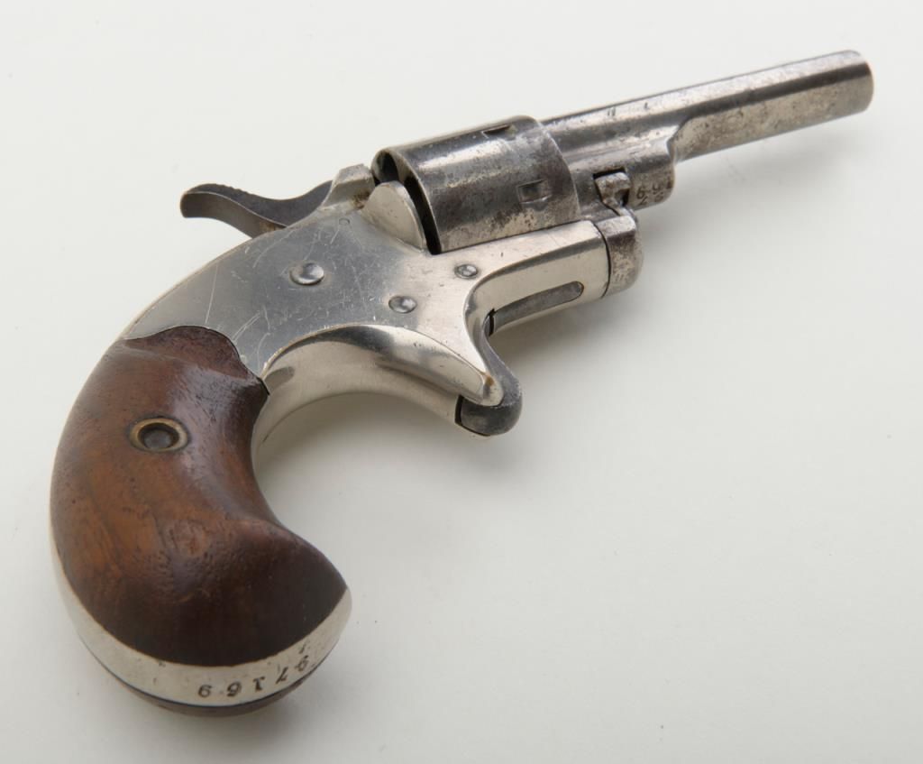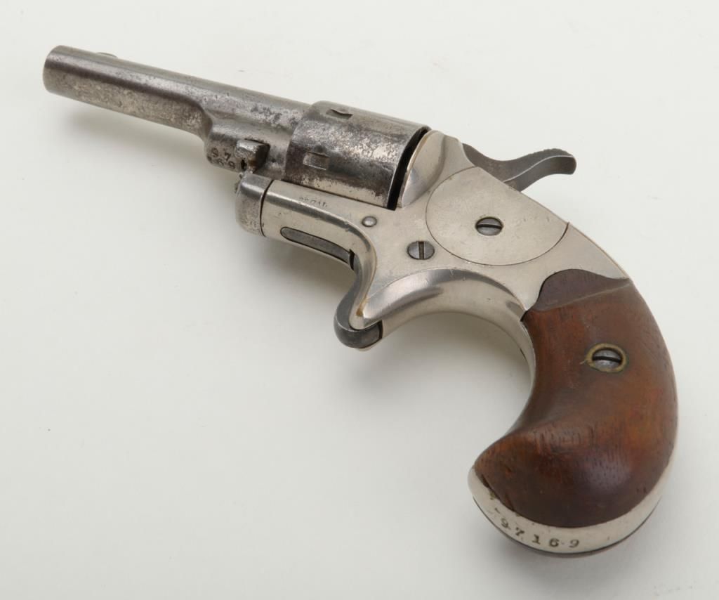 Colt Open Top spur trigger revolver, .22 cal., 2-1/2” barrel, nickel finish, wood grips, #97169 in overall very good condition showing considerable original finish, some scattered spots of erosion and old mars, good bore, crisp action, sharp markings and good grips. Est.: $175-$350.