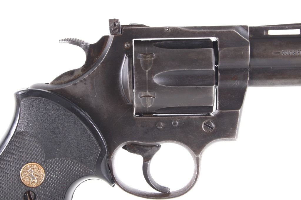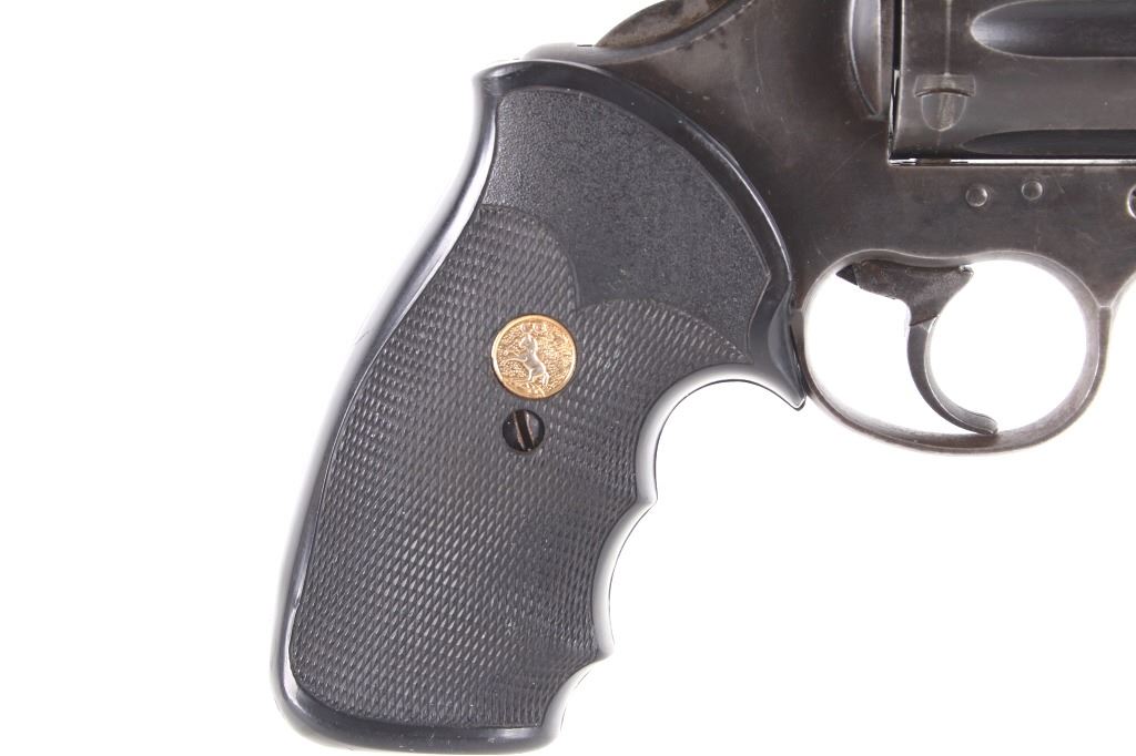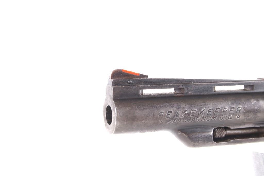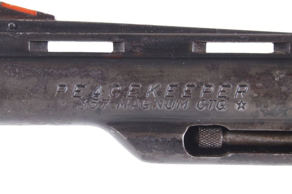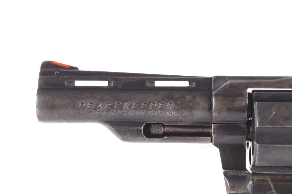 Featured in this lot we have a Colt Peacekeeper model double action revolver chambered in .357 magnum. This Mark V peacekeeper revolver was manufactured in 1985 by Colt. This revolver displays a 4" long ribbed barrel, six shot cylinder, hard rubber grips, fixed sights, and double action system. The revolver is marked across the left side reading "PEACEKEEPER 357 MAGNUM CTG." with the right side reading "COLT'S PT. F.A. MFG. CO. HARTFORD. CONN. U.S.A.". The frame of the revolver is stamped with the rearing horse Colt logo. The hard rubber grips display a checkered design with an inset colt medallion on each side on the top of the grips. Mechanically the revolver displays a crisp double action trigger with a smooth and responsive timing on the cylinder. The revolver shows good condition overall with wear across the piece due to handling and use. It weighs 2lbs 8oz. Serial Number: 49882 V. This is a modern firearm and requires a FFL transfer or NICS background check.