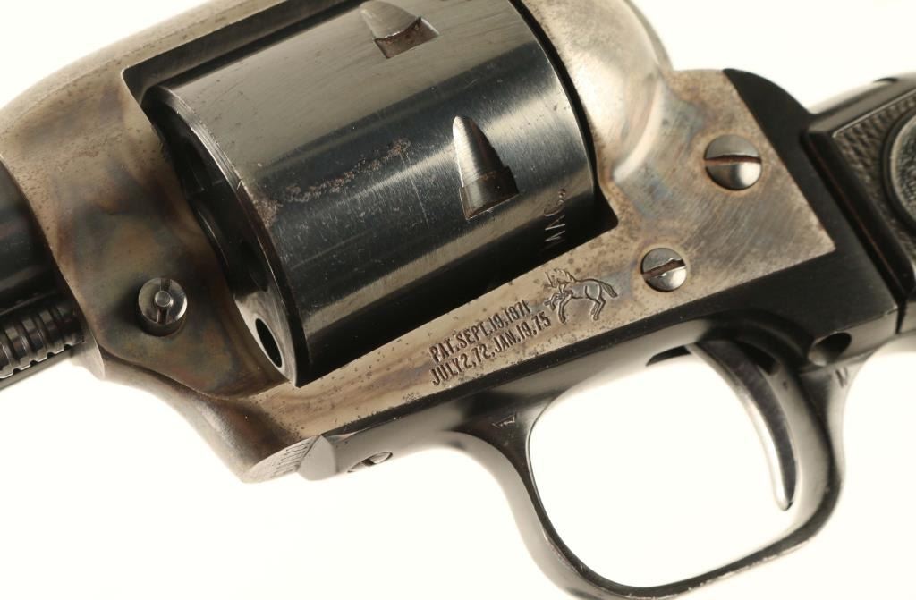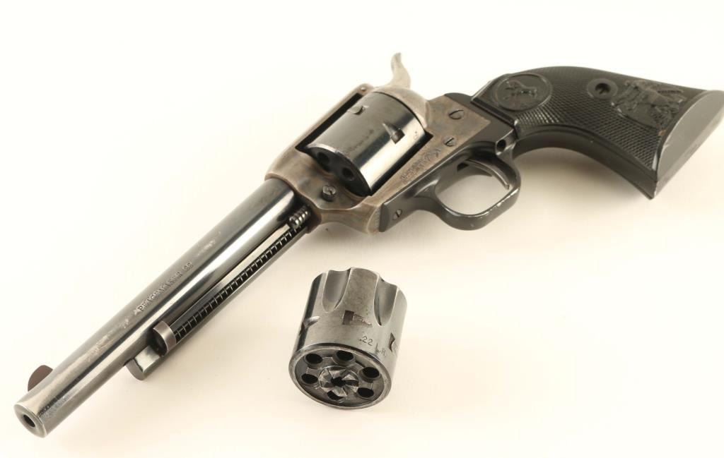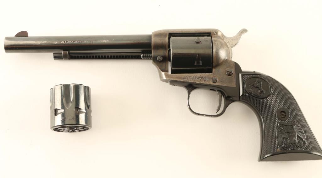 Small frame western style single action revolver with convertible .22 Long Rifle & .22 Magnum cylinders, manufactured in Hartford, CT circa 1974. Features a blued & case hardened finish, 6" barrel, blade front sight, square notched rear sight, smooth thin trigger, knurled hammer spur, non-fluted six-shot .22 Mag cylinder with counterbored chambers, ejector rod with crescent head, black finished alloy grip frame, and checkered black hard rubber grips with molded federal eagle & Rampant Colt décor. Includes a fluted .22 Long Rifle conversion cylinder. Revolver retains approximately 80% of its original finish showing holster wear, oxidation on the frame with muted case colors and some surface rust on the front sight & top of the barrel. Action is sound with good lock-up, the bore is pristine and the grips are very good with some blemishes & wear. Condition is NRA Good. ***Modern Firearm***