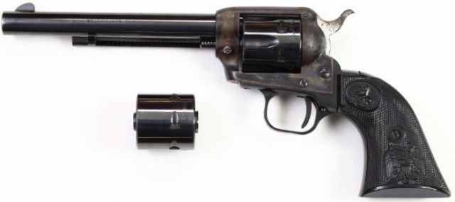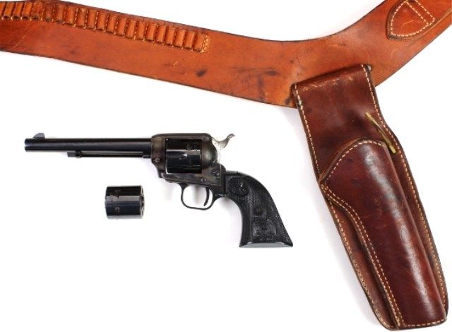 action revolver 6" barrel, blue and case hardened finish, dual cylinders, hard rubber checkered grips. Loss of blue and pin prick pitting on ejector rod housing and cylinder, top of frame and recoil sheild with light surface rust drifted to brown all from poor storage, remainder bright. Excellent action and bore. Includes Hunter buscadero rig. Modern. Est. 500-650
