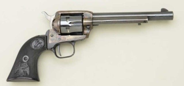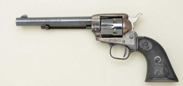 Colt Peacemaker .22 single action revolver, .22LR cal., 6” barrel, blue and case hardened finish, checkered black hard rubber grips, #G130628. This gun is in overall very good condition showing considerable originalfinish with holster wear and some scattered light spots of erosion, bore should clean to good; fine grips. Est.: $250-$450.