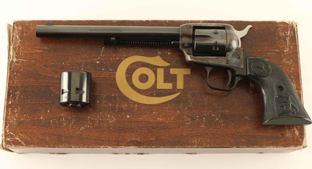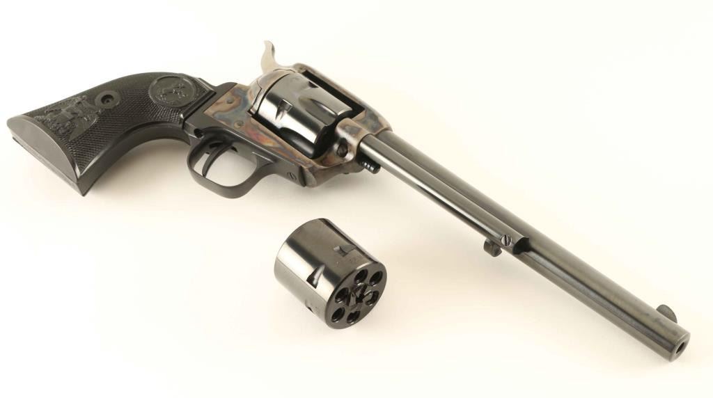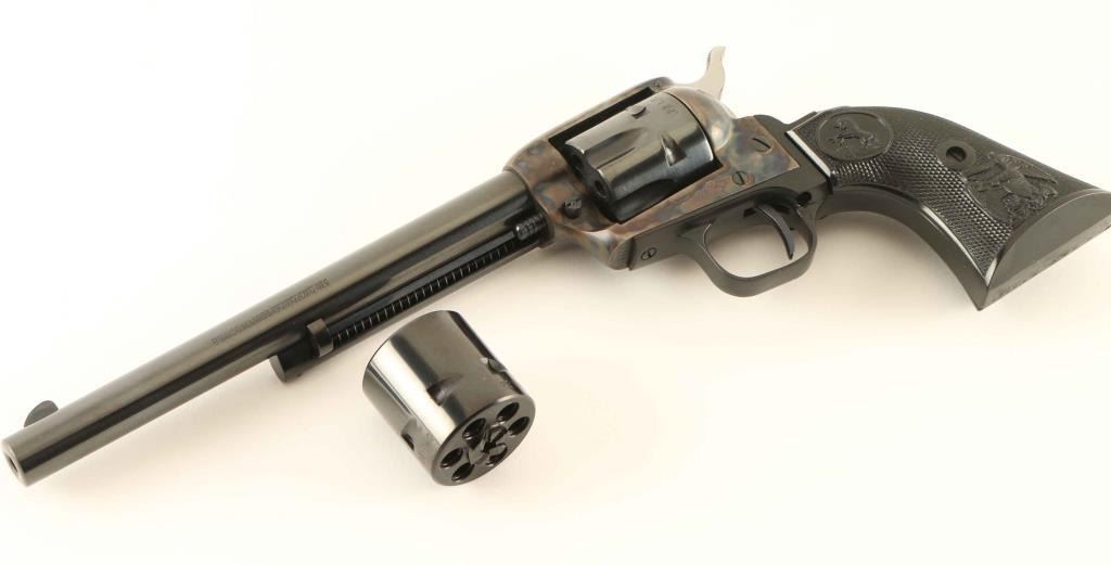 SN: G162291 Small frame single action revolver chambered in .22 Long Rifle or .22 Magnum, manufactured circa 1976. Features a blued 7.5" barrel, blade front sight, square notched rear sight, smooth trigger, knurled hammer spur, fluted six-shot .22 LR cylinder, case hardened frame, black finished alloy grip frame with roll-stamp engraved butt, and two-piece checkered black synthetic federal eagle grips. Includes a factory wood grain cardboard box with styrofoam inserts, documents, un-fluted .22 Mag cylinder and label with the serial number "G162291" indicated. Revolver exhibits approximately 98%+ of it's original finish showing a few scattered scratches. Action is crisp with very good lock-up, the bore is pristine and the synthetic grips are fine. Condition is near NRA Excellent in box. ***Modern Firearm***
