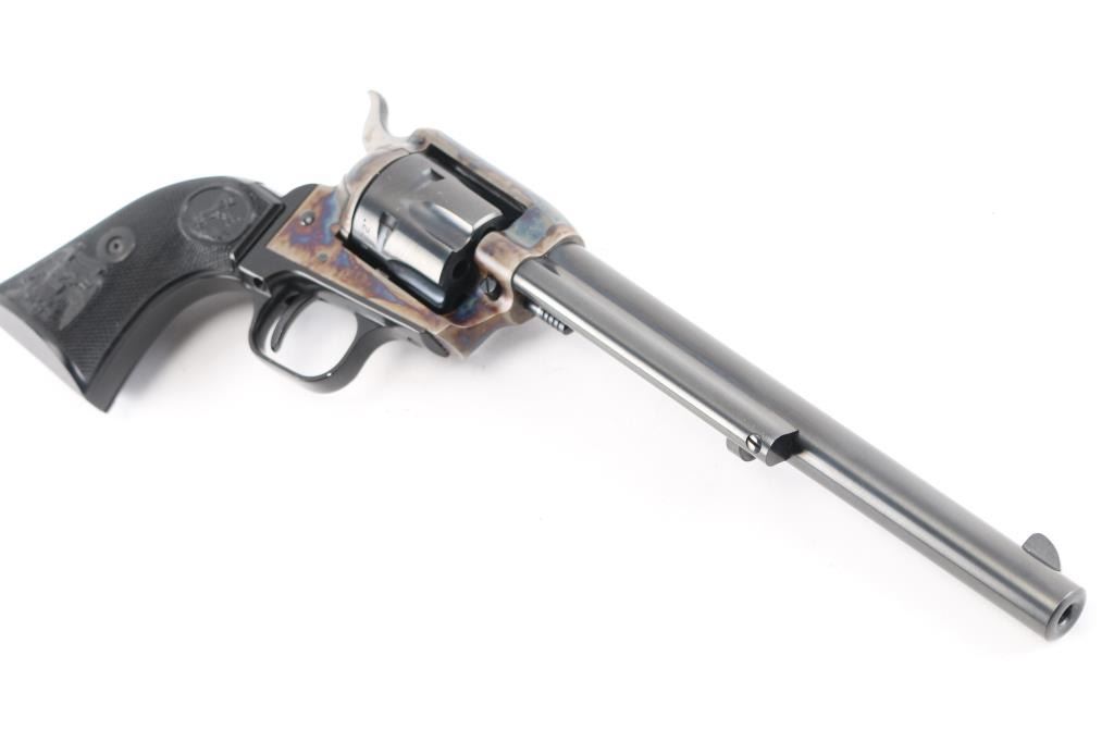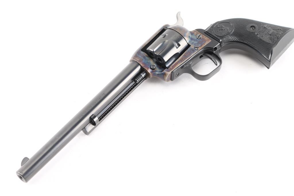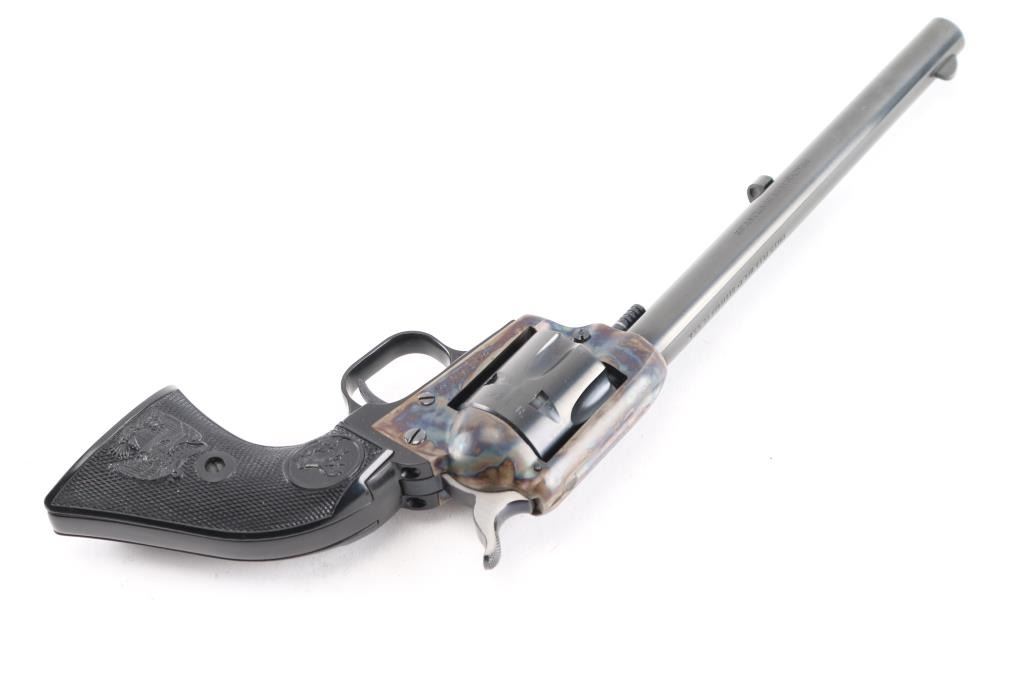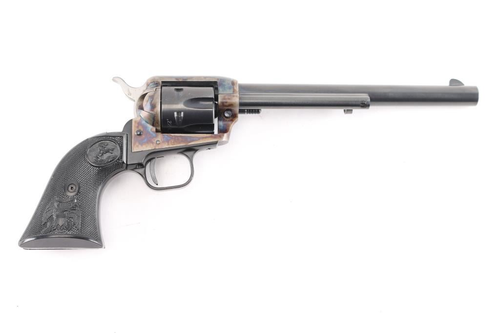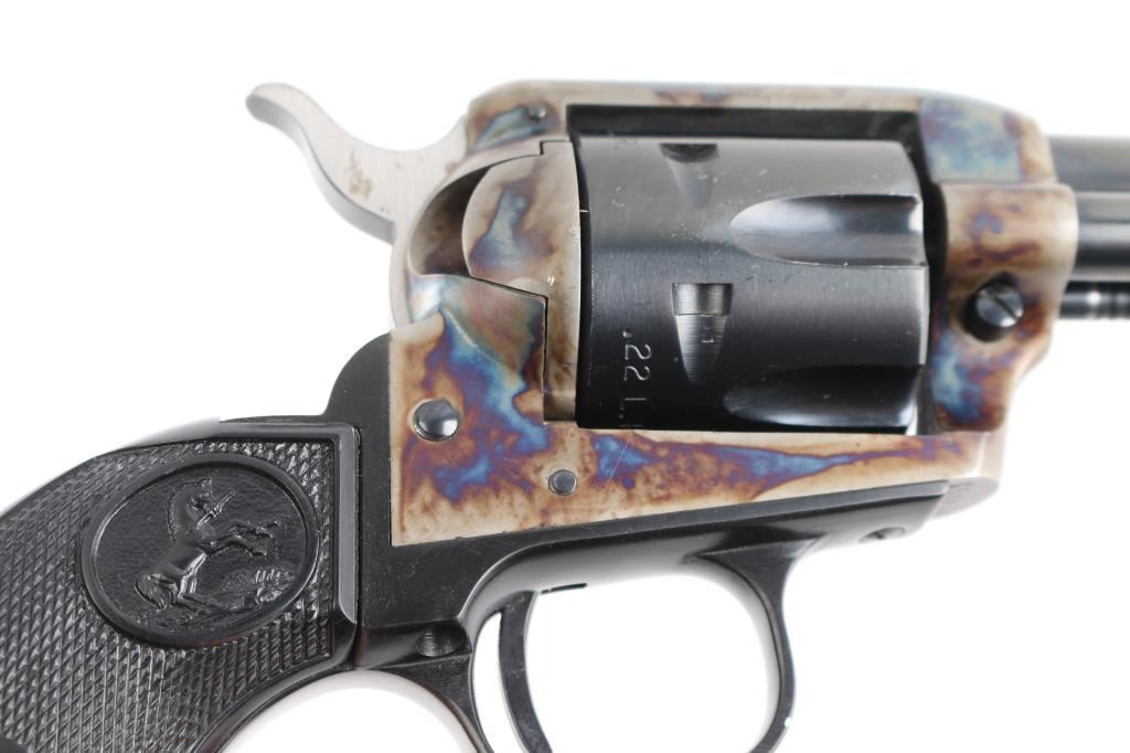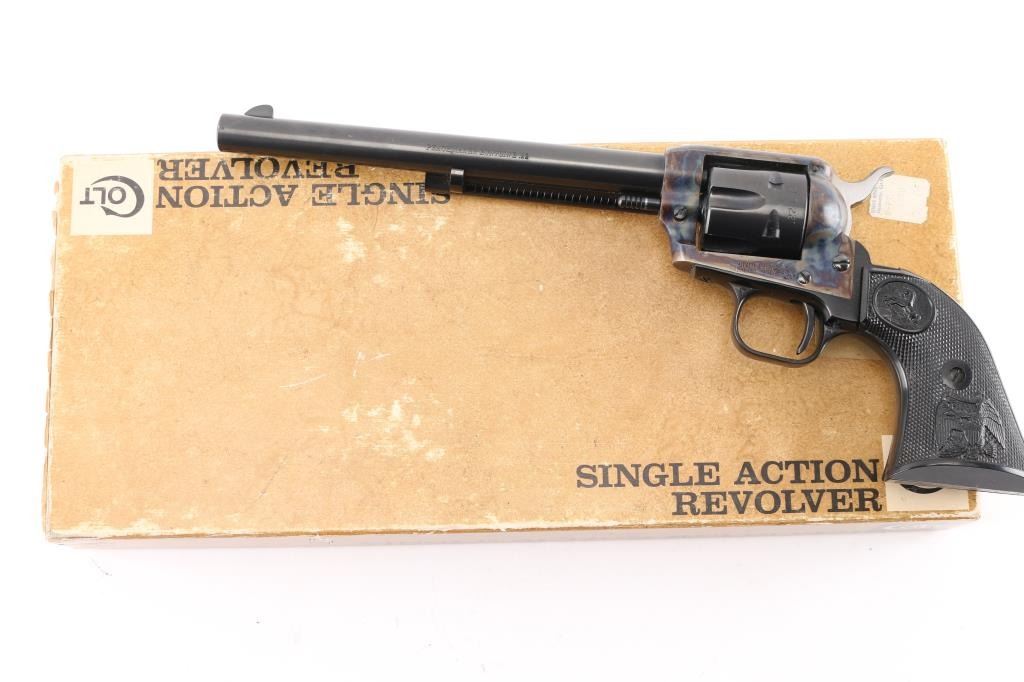 Small frame single action revolver chambered in .22 Long Rifle, manufactured circa 1972. Features a blued 7.5" barrel, blade front sight, square notched rear sight, smooth trigger, knurled hammer spur, fluted six-shot cylinder, case hardened frame, black finished alloy grip frame with roll-stamp engraved butt, and two-piece checkered black synthetic federal eagle, Rampant Colt grips. Includes a factory cardboard box with matching serial number on the end label, documents, manual. (Box has the original price tad from Simms Hardware, Sacramento for $79.95) Revolver exhibits approximately 98+ of it's original finish showing a couple of rubs on the cylinder . Action is crisp with very good lock-up, the bore is pristine and the synthetic grips are fine.
