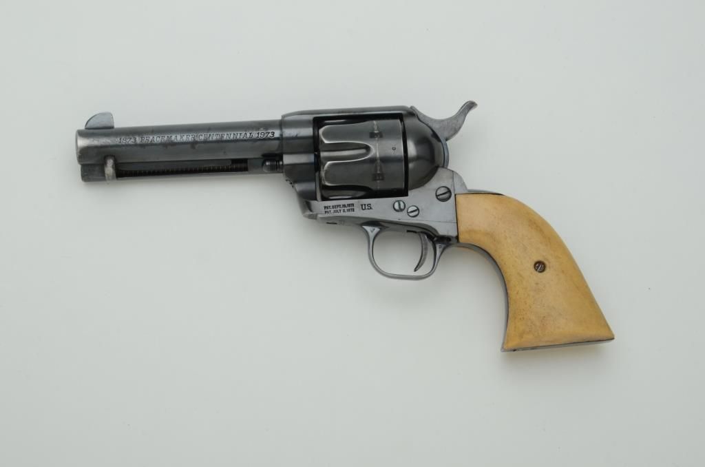 Colt Peacemaker Centennial (1873-1973) SAA revolver, .45 cal., 4-3/4” barrel, blue finish, bone grips, #PC1158. This gun is in overall very good condition showing approx. 90% muted original finish with holster wearand some scattered spots of erosion, good bore, crisp action, sharp markings and very good grips; U.S. marked frame with “P” proofs and “C” inspector marks. Est.: $500-$1,000.