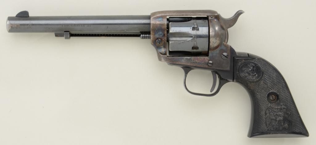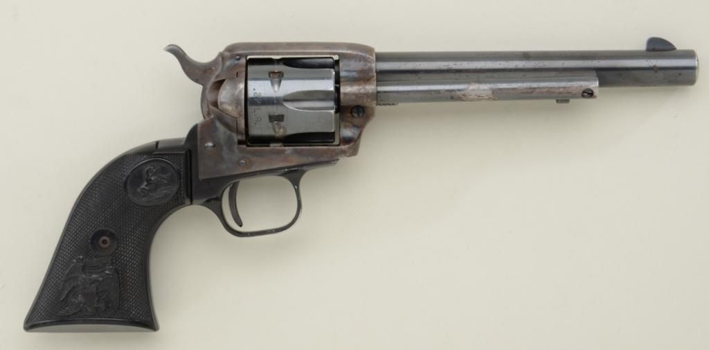 Colt Peacemaker Model SAA revolver, .22 cal., 6” barrel, blue and case hardened finish, checkered black hard rubber eagle grips, #G87904. This gun is in overall good to very good condition showing considerable originalblue and case colors with some scattered spots of erosion and loss to finish at muzzle and on ejector rod housing; grips are very good; gun would improve with a careful cleaning. Est.: $225-$450.
