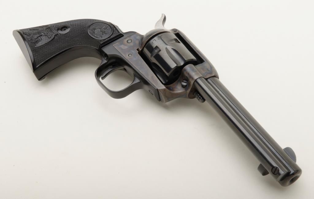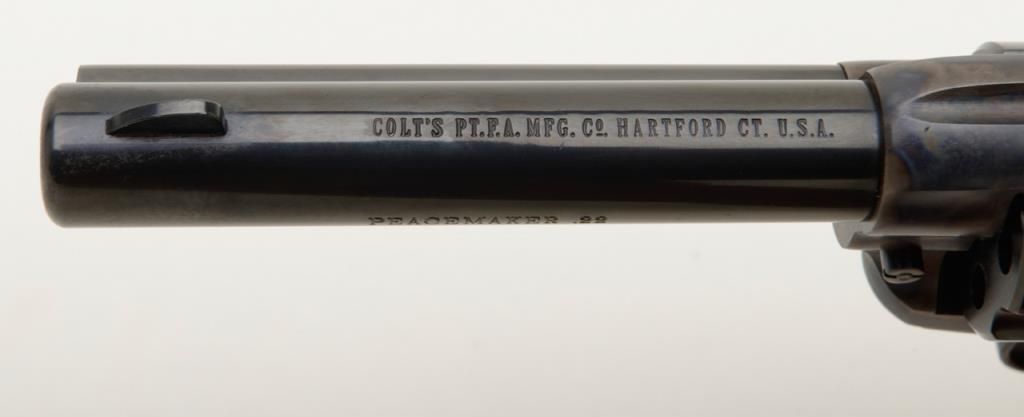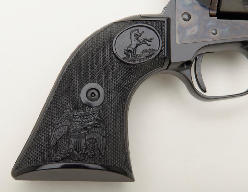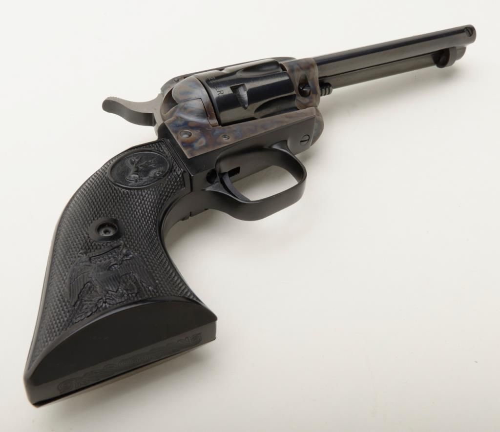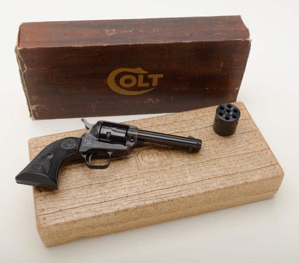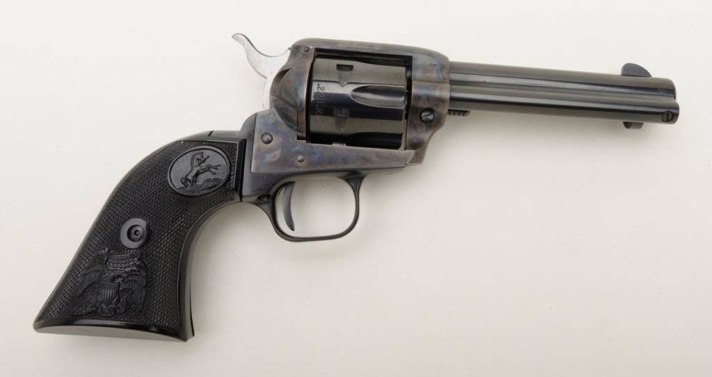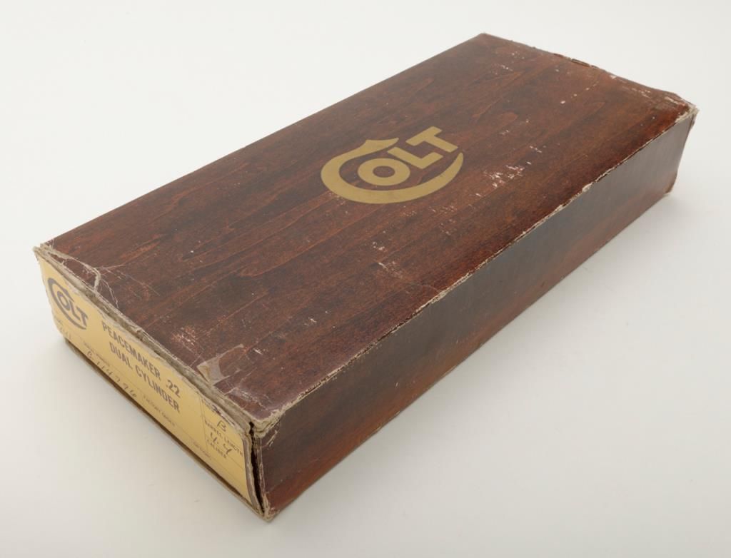 Colt Peacemaker Single Action revolver, dual cylinder, .22LR and .22 Mag., 4.4” barrel, blue and case hardened finish, checkered eagle hard rubber grips, #G114796 in like new condition showing little handling, with factory wood grained cardboard box missing one end flap, containing Styrofoam insert; box numbered to this gun. Est.: $350-$700.