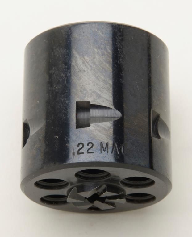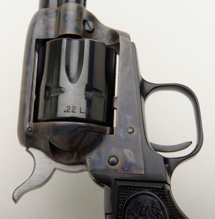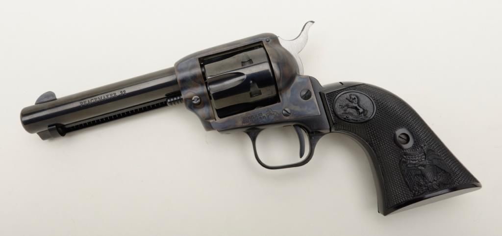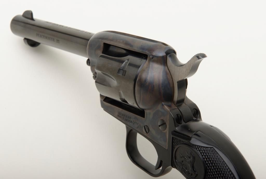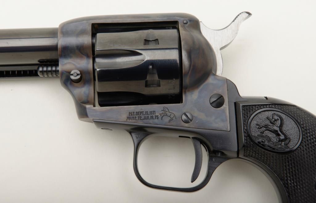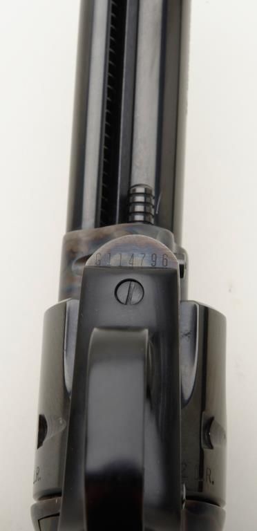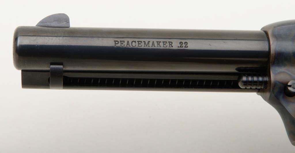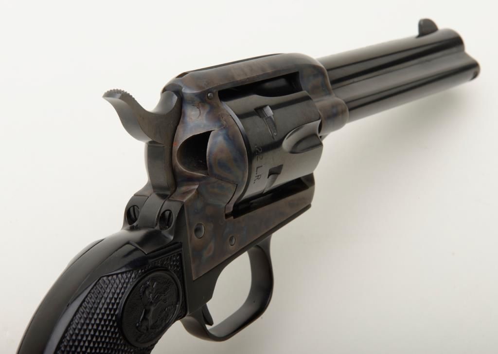 Colt Peacemaker Single Action revolver, dual cylinder, .22LR and .22 Mag., 4.4” barrel, blue and case hardened finish, checkered eagle hard rubber grips, #G114796 in like new condition showing little handling, with factory wood grained cardboard box missing one end flap, containing Styrofoam insert; box numbered to this gun. Est.: $350-$700.