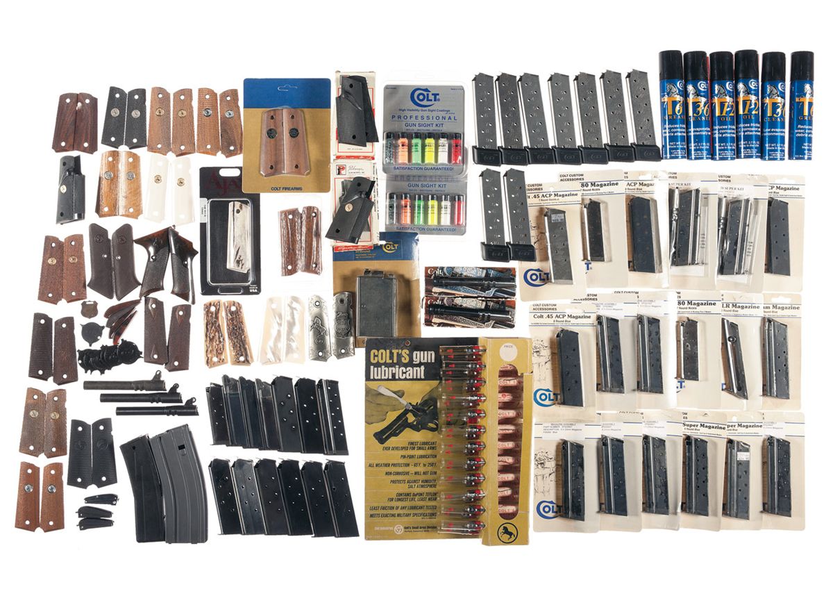 Approximately 25 Colt magazines (mostly 45 ACP), 4 Colt 45 ACP barrels, approximately 34 assorted grips (such as walnut, plastic, rubber, stag) for Colt pistols (mostly 1911 types), assortment of Colt pistol parts such as checkered mainspring housings, magazine extensions, Woodsman grip adapters, and springs. Approximately 45 various Colt pistol magazines, 3 Colt 38 Super kits (magazine and barrel), 5.56mm Colt rifle magazine, Colt 22LR AR-15 magazine, 4 Colt tools, Colt 45 ACP recoil spring, Colt dealer lubricant display with lubricant, 12 cans of Colt grease, 2 packages of Colt high visibility gun sight coatings professional kits, approximately 66 three-head Colt screwdrivers, with 9mm Hi-Power magazine, unidentified pistol magazine, unidentified rifle magazine, M1 carbine magazine, and 12 wooden dowels.