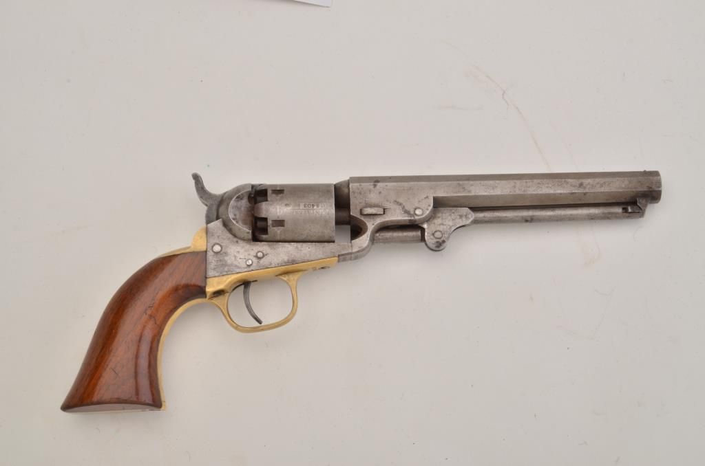 Colt Pocket Model, 6” barrel, #268403, 1-line address, 6-shot, scarce variation, brass straps, wood grips in overall good condition; head of hammer screw broken off. Est.: $400-$800.