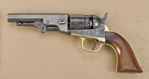 Colt Pocket Navy, .36 caliber, 4-1/2” barrel, serial #8440 with butt stamped “USN” in large block letters. The revolver shows a grey to patina finish with traces of blue and case hardening mixed in, some scatterederosion and pinprick pitting on the cylinder, frame, and hammer. Some slightly heavy pitting on the hammer and cylinder. The grips show 50-70% varnish with some wear at the edges and small losses. The markings aregood, the action is good, all matching interior serial numbers. Some considerable research has been done on the USN markings, but no conclusion. Est: $2,250 - $4,500