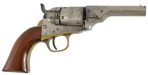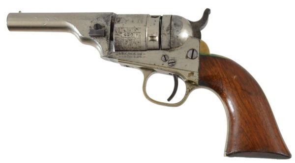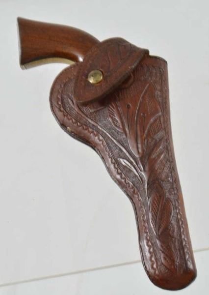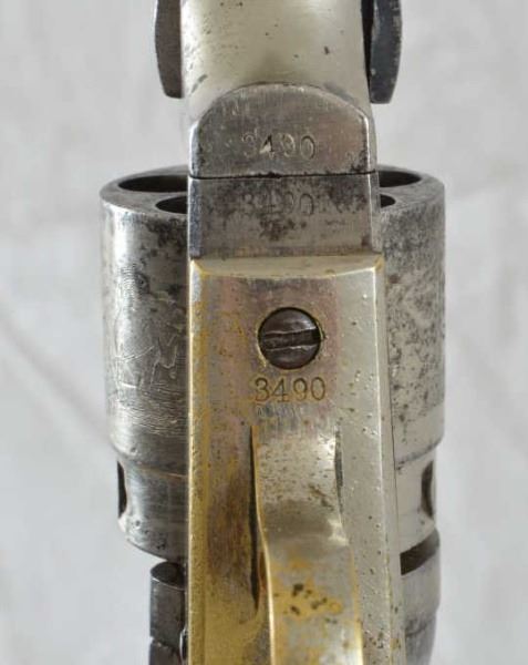 Serial no. 3490 36 rimfire 3 1/2" barrel. in very good condition retains 85% of original finish with loss on frame near cylinder, edge of cylinder & back strap/trigger guard. With carved floral design half flap holster.