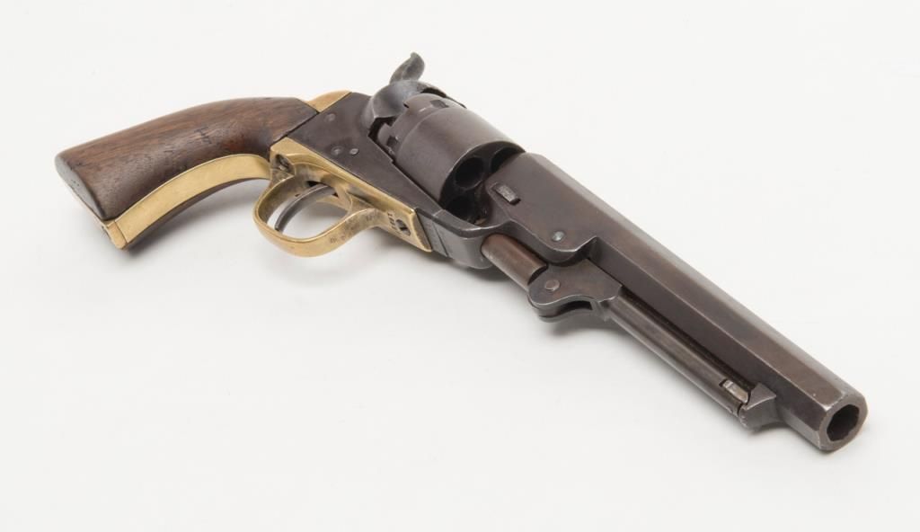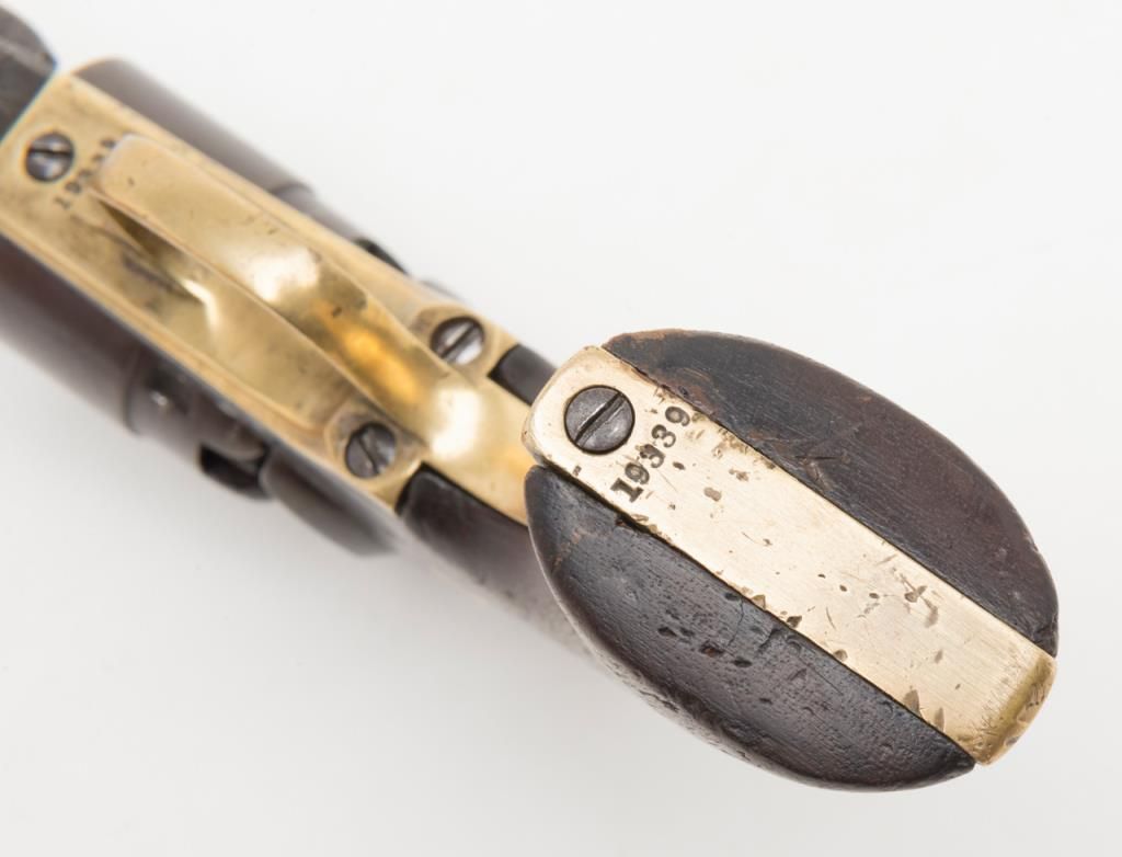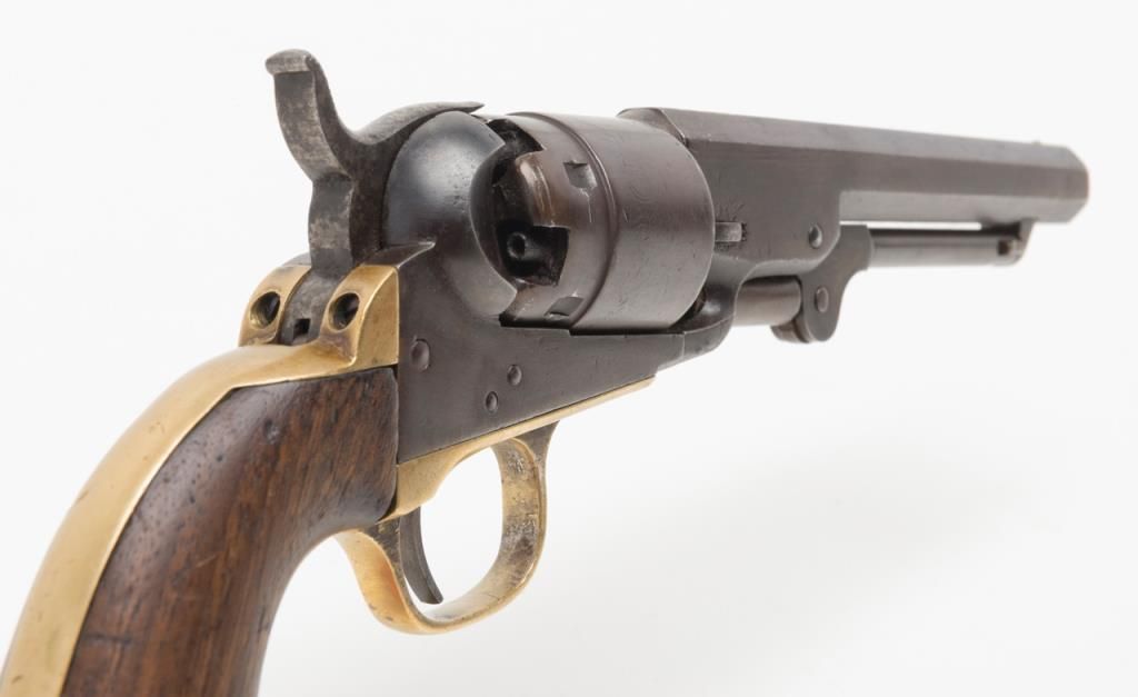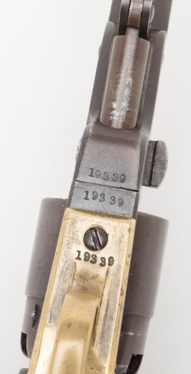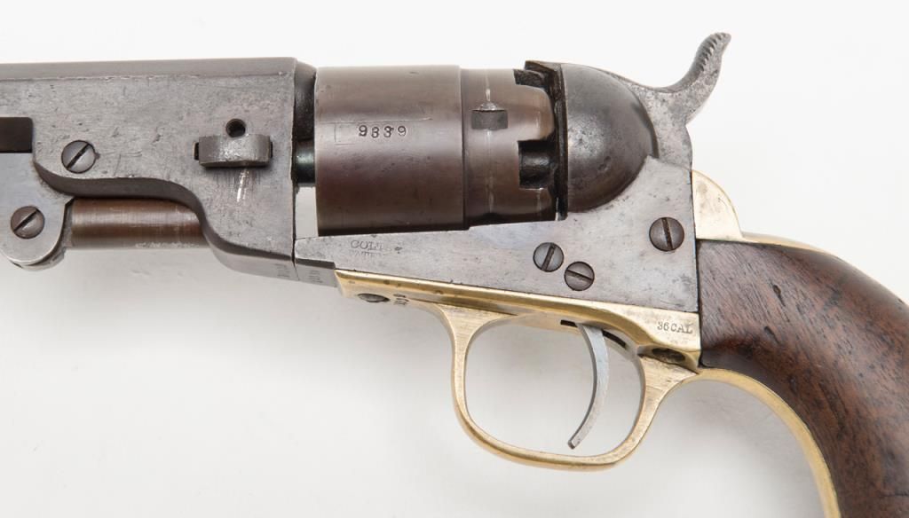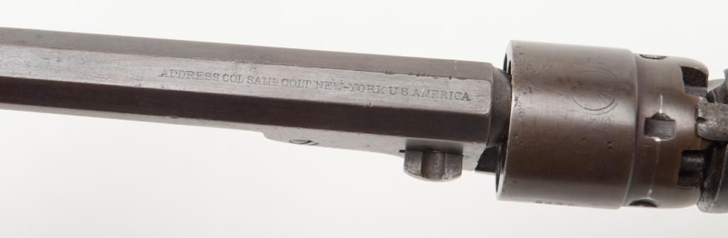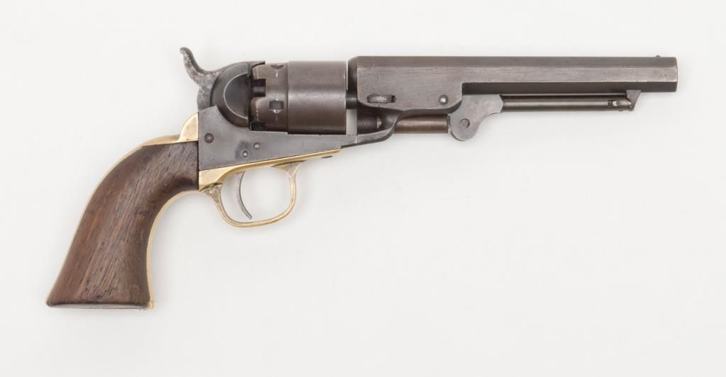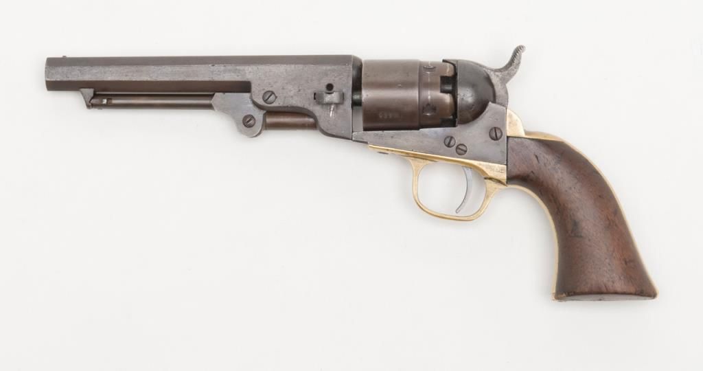 Colt Pocket model of Navy caliber with 5 ½” barrel and lightly re-browned finish with some restoration of markings and serial numbers. The barrel address is light but legible as are the frame markings. The wedge screw is missing. Thegrips have been lightly cleaned and are slightly undersized. The number on the cylinder and trigger guard have been refreshed and the numbers are now matching. An acceptable example of the scarce percussion Colt in an affordable price range.Est.: $600-$1200