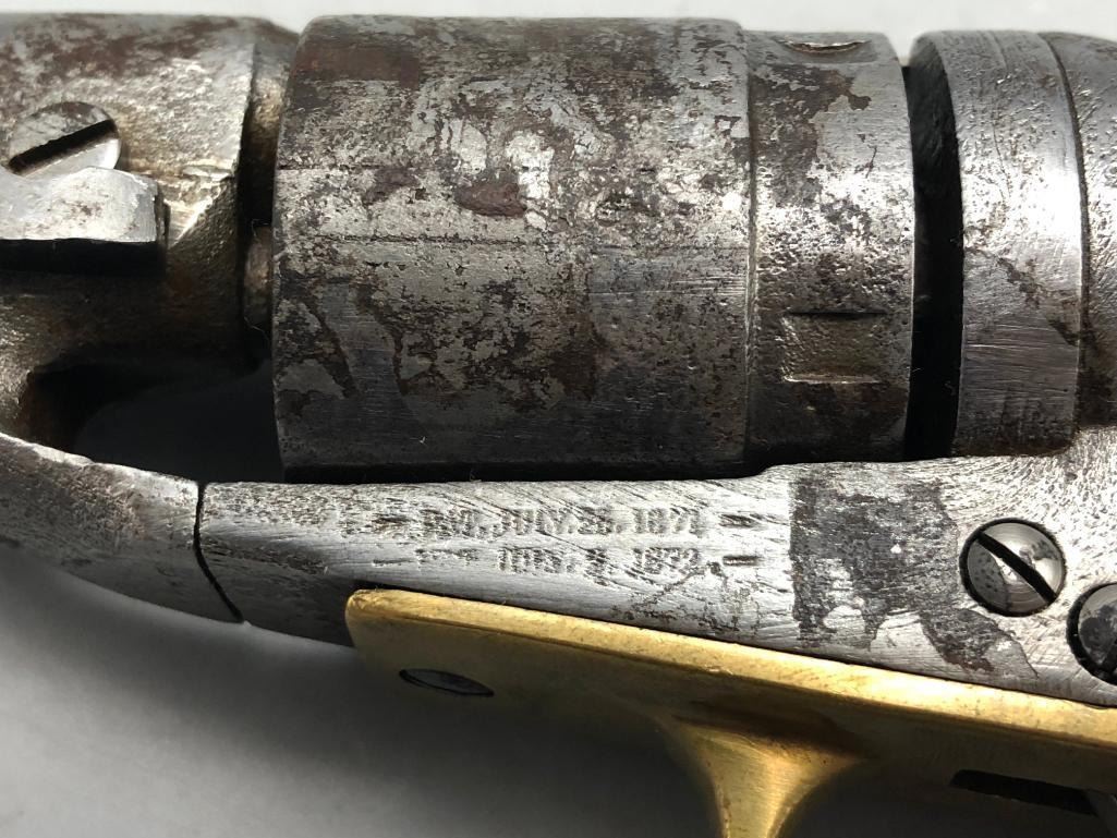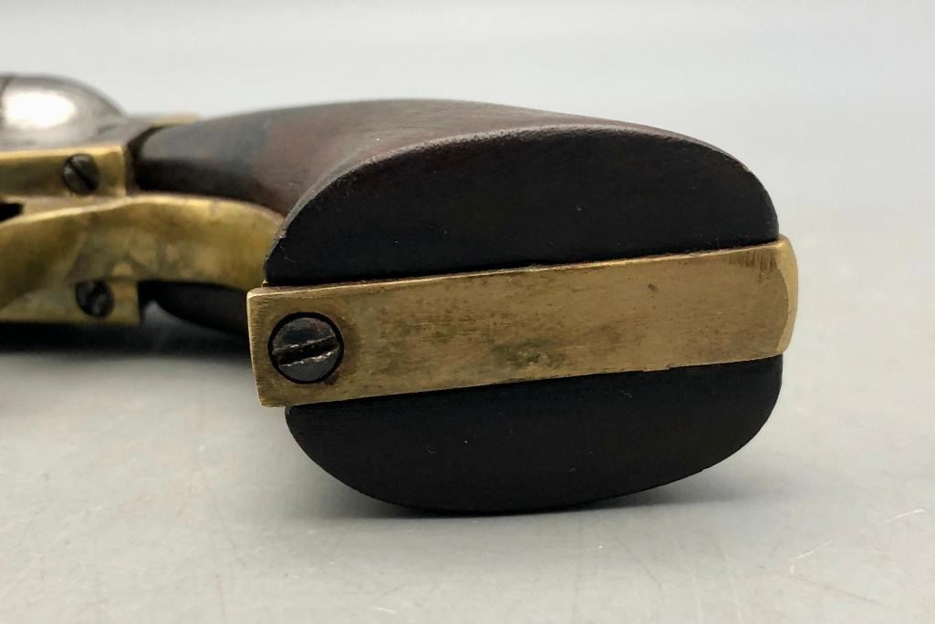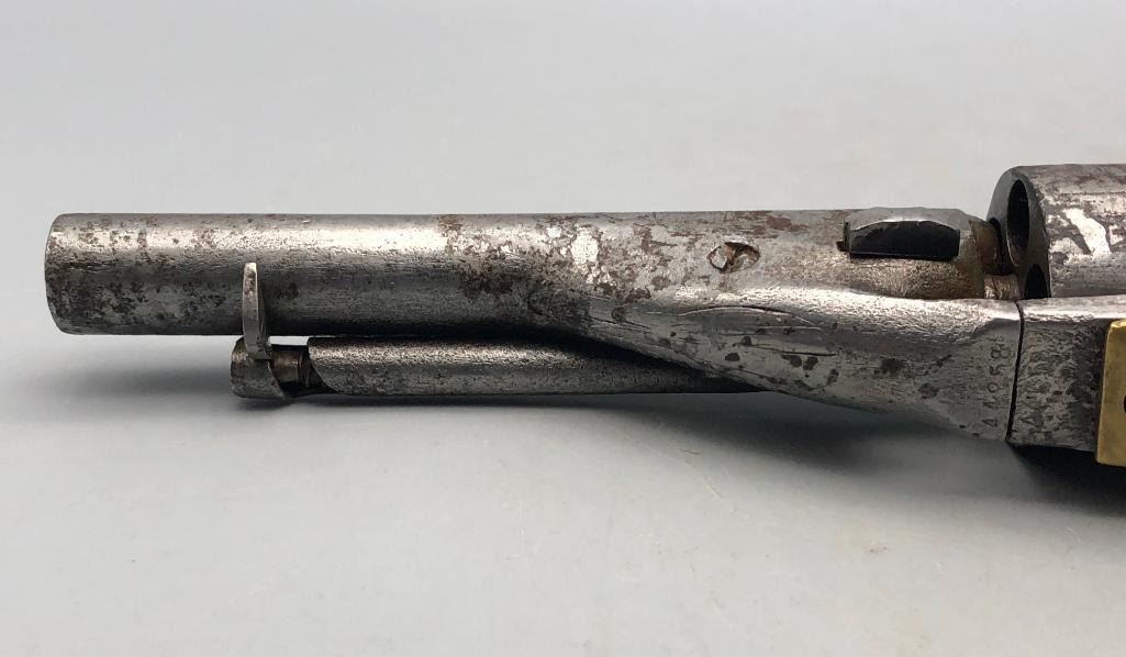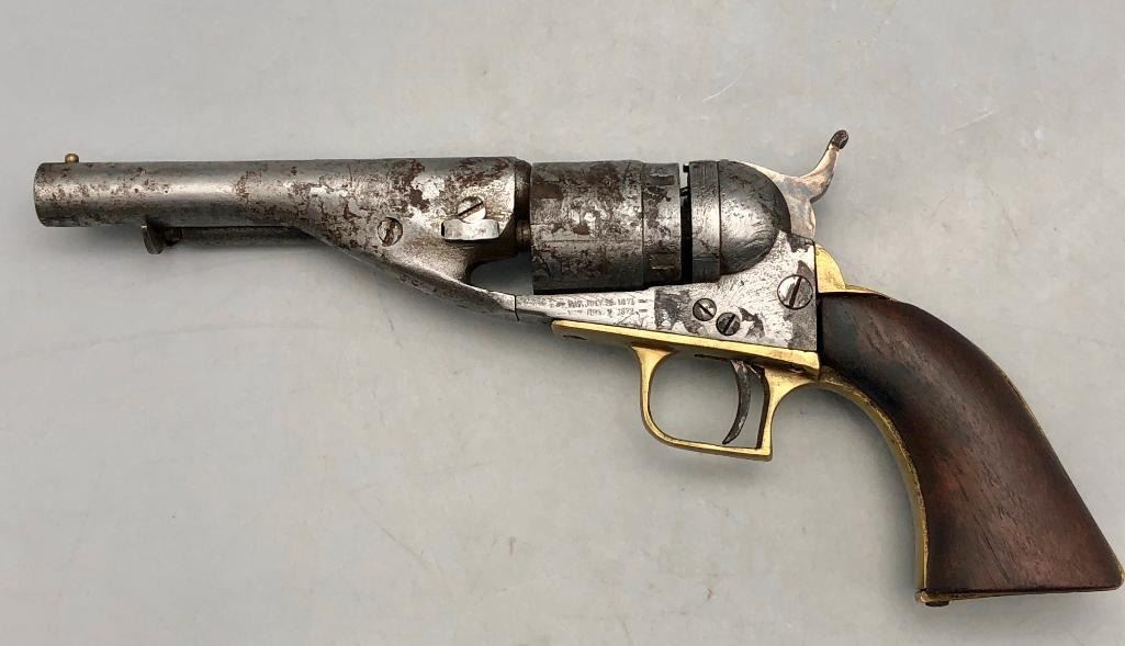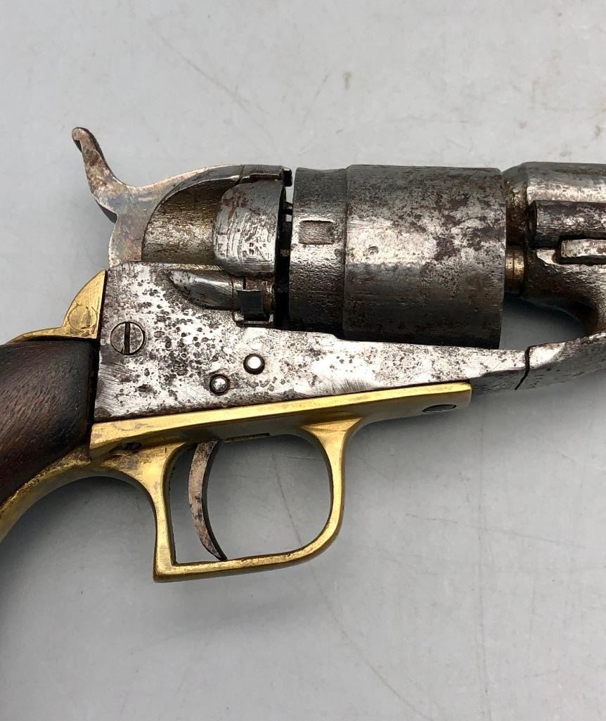 For sale in this lot is an antique Colt conversion revolver. This pistol shows signs of wear from age and use, typical of a pistol this age. It has been converted from a percussion pistol to a rimfire cartridge firing pistol, even a shell ejector rod was been added. The metal had a nickel finish which now has pitting and rust. It has the original wood grips, and it cycles properly, however we have not fired it. Keep in mind this is an antique and not warranted safe to shoot and it should not be attempted without the aid of an expert. Maker: Colt. Serial No. 44958? (hard to read). Approx. Age: 1871. Size: Barrel length is 4-1/2 inches. 38 rimfire caliber? Condition: Poor for its age, wear expected. Please look closely at the pictures - they are an important part of our description. Shipping: There will be a $15 handling / packaging fee for shipping this lot. The actual cost of postage will be added on top of that. BUY IT NOW: If you would like to buy this item now without waiting for the auction to end (this option is only available up to 48 hours before the auction starts to close), the “Buy it Now” price is the high estimate of this lot. If you would like to end the auction early and pay the high estimate (plus applicable fees), please contact us by phone or email and reference this lot number. *****ANTIQUE - This firearm DOES NOT REQUIRE an FFL Transfer*****