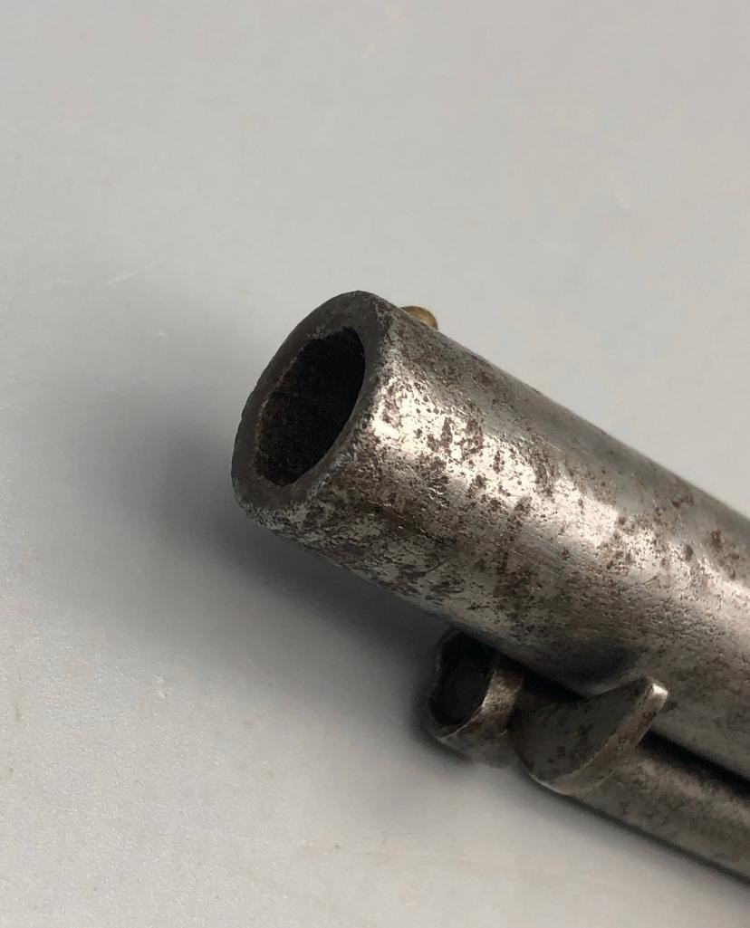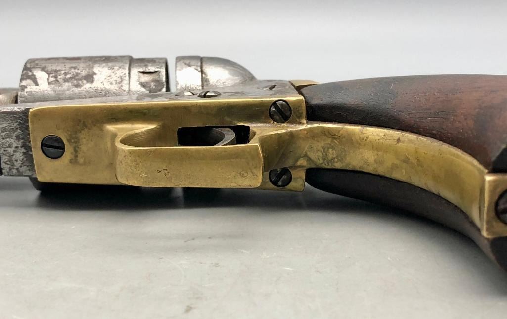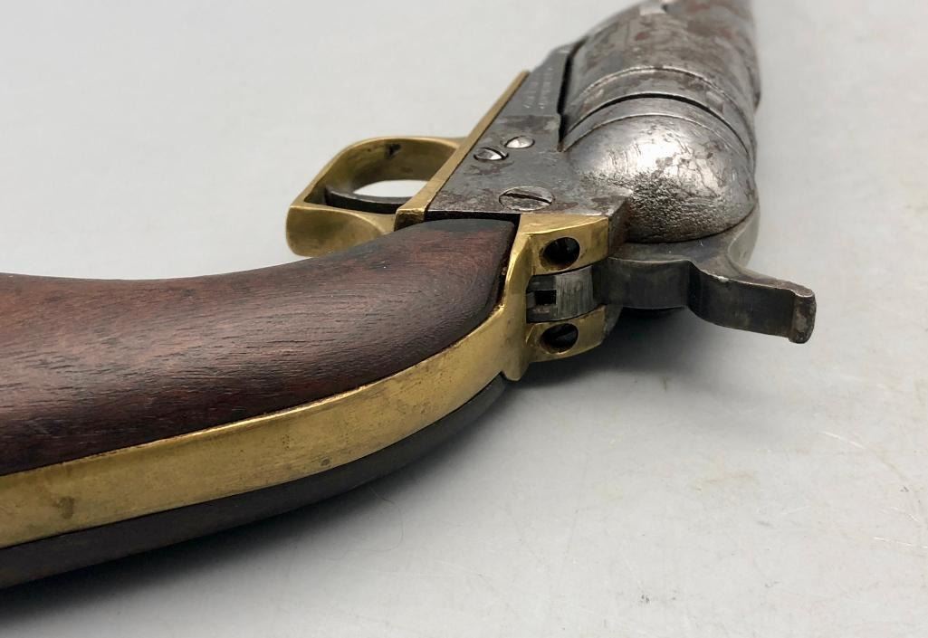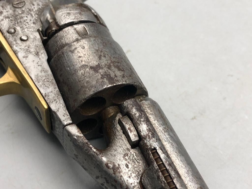 For sale in this lot is an antique Colt conversion revolver. This pistol shows signs of wear from age and use, typical of a pistol this age. It has been converted from a percussion pistol to a rimfire cartridge firing pistol, even a shell ejector rod was been added. The metal had a nickel finish which now has pitting and rust. It has the original wood grips, and it cycles properly, however we have not fired it. Keep in mind this is an antique and not warranted safe to shoot and it should not be attempted without the aid of an expert. Maker: Colt. Serial No. 44958? (hard to read). Approx. Age: 1871. Size: Barrel length is 4-1/2 inches. 38 rimfire caliber? Condition: Poor for its age, wear expected. Please look closely at the pictures - they are an important part of our description. Shipping: There will be a $15 handling / packaging fee for shipping this lot. The actual cost of postage will be added on top of that. BUY IT NOW: If you would like to buy this item now without waiting for the auction to end (this option is only available up to 48 hours before the auction starts to close), the “Buy it Now” price is the high estimate of this lot. If you would like to end the auction early and pay the high estimate (plus applicable fees), please contact us by phone or email and reference this lot number. *****ANTIQUE - This firearm DOES NOT REQUIRE an FFL Transfer*****