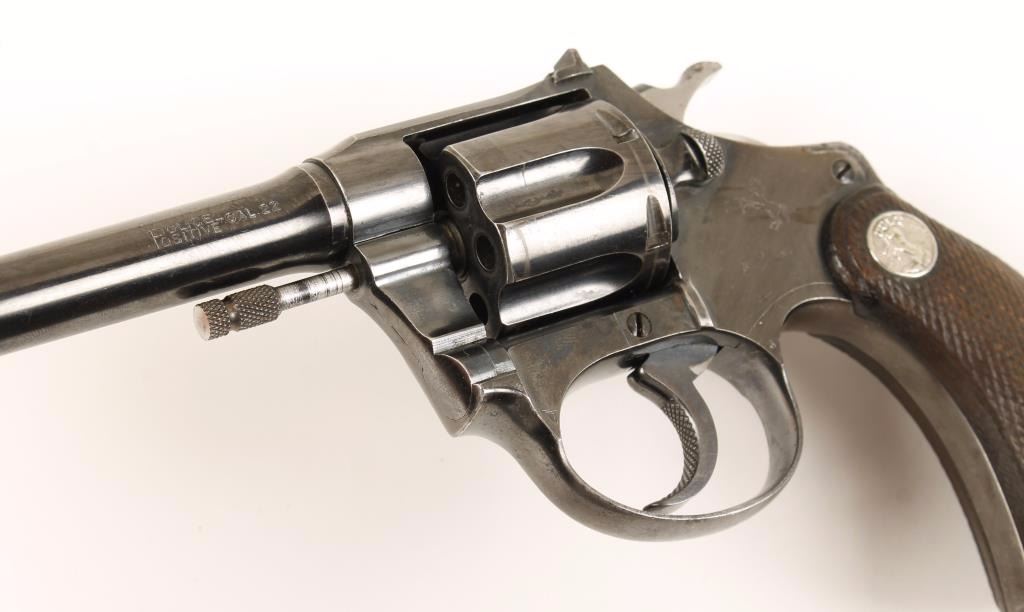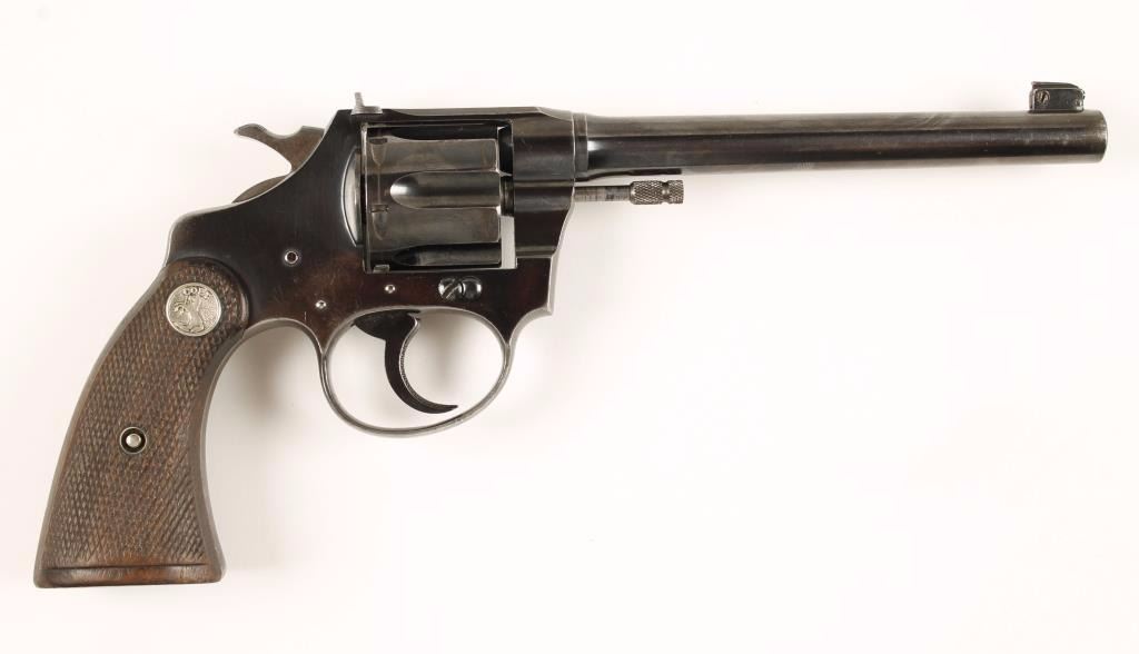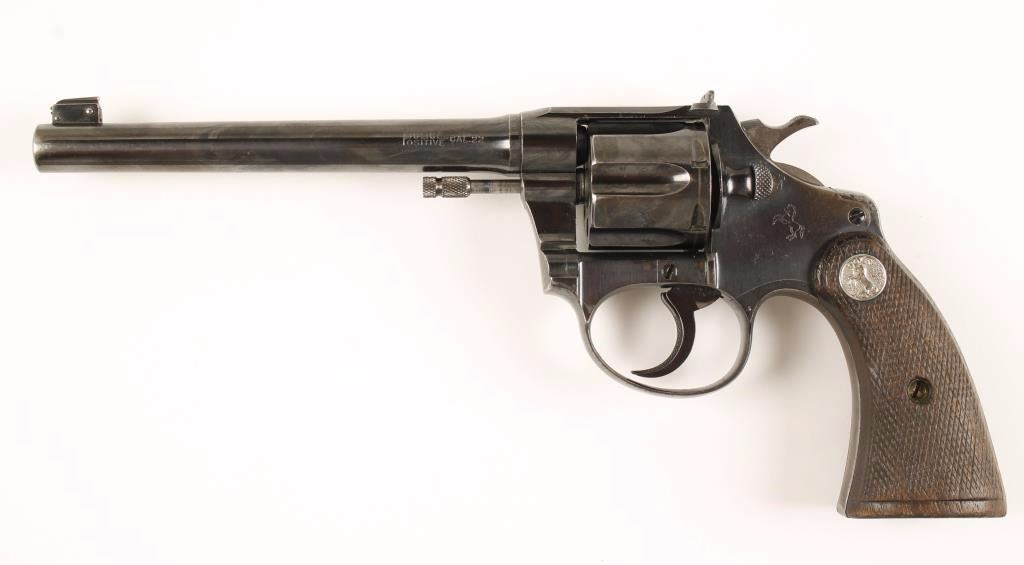Blued double action six-shot revolver chambered in .22 caliber, circa 1905. Features a full blue finish, 6" tapered barrel, undercut front sight, adjustable rear sight, flat-top frame, matte top-strap, checkered trigger & hammer spur, fluted cylinder and Colt medallion checkered walnut grips. Finish shows light/moderate muzzle wear, areas of high edge wear, and moderate handling wear with 90%+ original bluing retained. Cylinder has a drag line and curved lines on the front of the cylinder in between the flutes. Bore is excellent, action is smooth, lock-up is good and grip are good but are worn semi-smooth. Overall condition is very good. ***Modern Firearm***