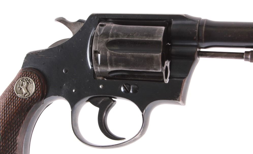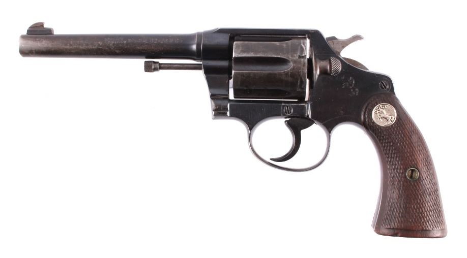 This is a Colt's Patent Firearms Police Positive double action revolver chambered in the .32-20 cartridge. The revolver was manufactured in 1924 and features a blued finish with a six shot cylinder and a 5" barrel. The grips are checkered walnut with a colt medallion on each side. The barrel is marked "Colt's Pt. F.A. Mfg. Co. Hartford Ct. U.S.A.". The Police Positive revolver is in good condition. It measures 4.5" x 9.5". Serial number 306833