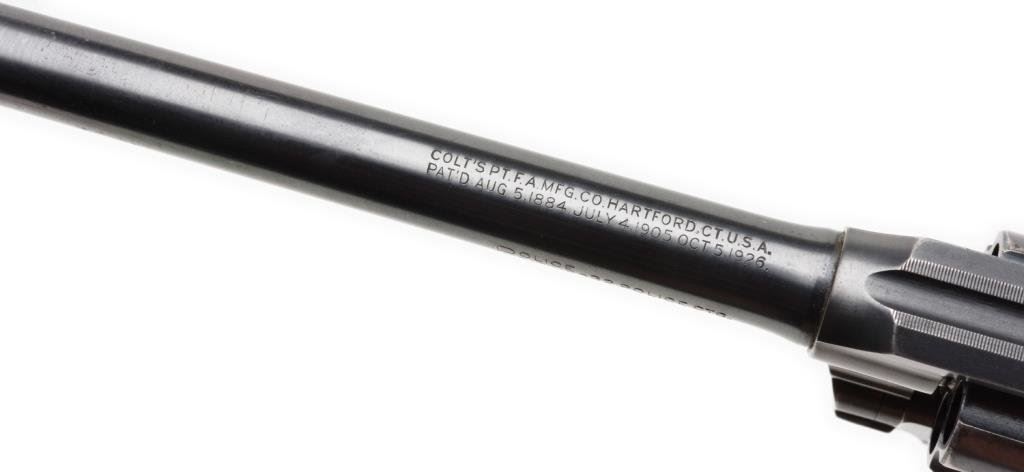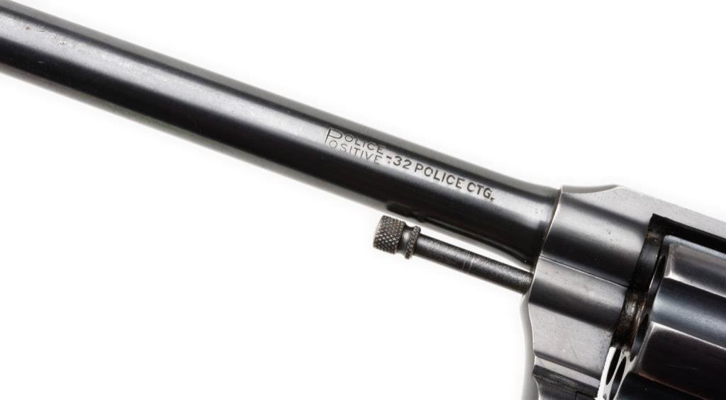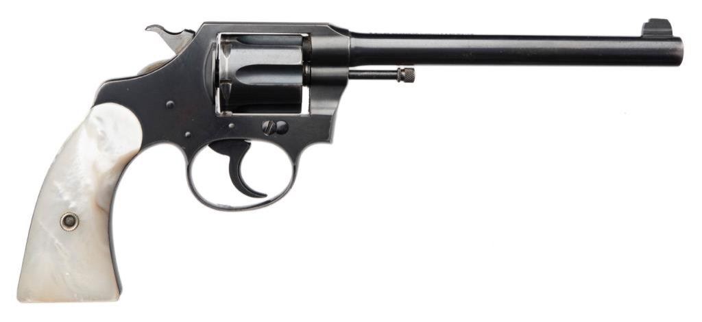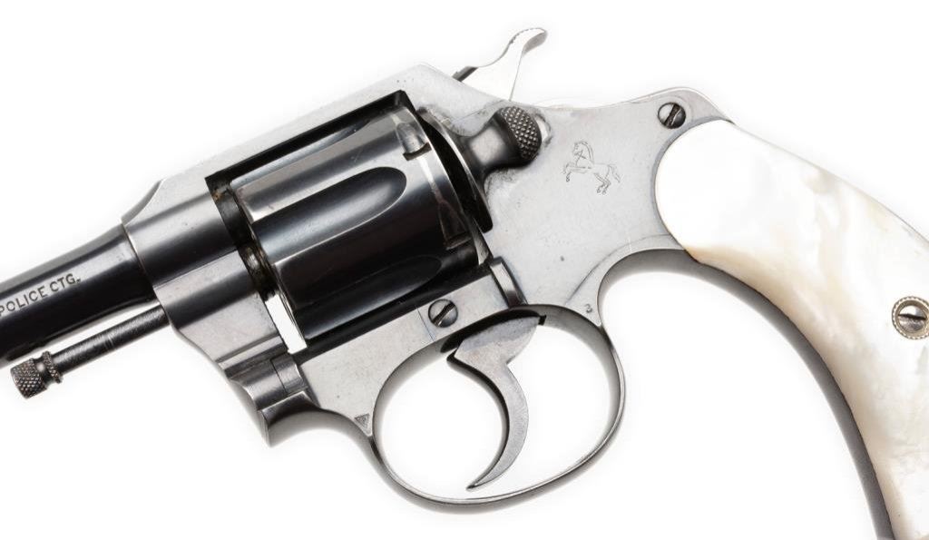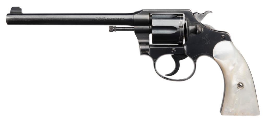 Colt Police Positive .32 Cal. D.A. revolver with pearl grips, 6" BBL, S/N 230378. 90%-95% original blue remains with normal aging and minor wear at the contact points. Very good period pearl stocks with slight losses and just minor imperfections. Good action and bore. A pleasing early Colt. Est.: $400-$800