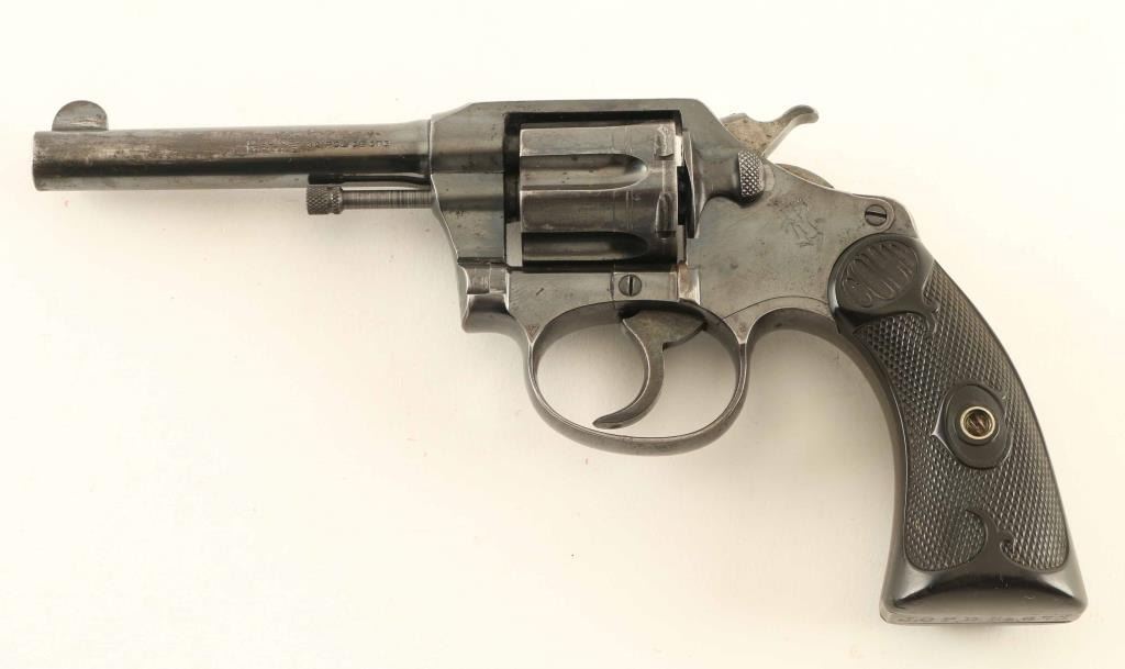 Revolver, Double-action. 6-rd capacity. Jersey City, N.J. Police Department issued revolver. Manufactured 1916. Butt stamped "J.C.P.D. No 671." 4" round barrel, with round front sight blade, and cut notch rear sight. blued metal finish. Black, hard rubber, "Colt" grips. Rampant Colt on left frame. "Police Positive, .32 Police ctg." on left side of barrel. Colt address, and patent dates in 2-lines on top of barrel. Action is crisp/tight. Bore, and cylinder chambers appear excellent/bright. All markings are crisp/clear. Grips are very good. Blued metal finish is about 80%, with holster wear, mainly on the upper barrel, and cylinder. Some small scratches/dings. A very nice conditioned Police issued revolver for its age. NRA Condition-very good. Modern Firearm. C&R Eligible.