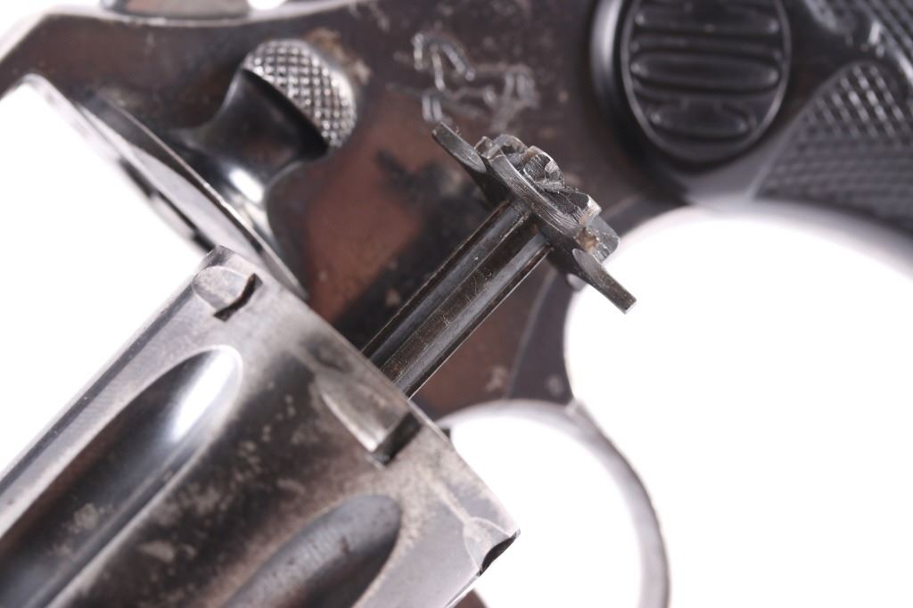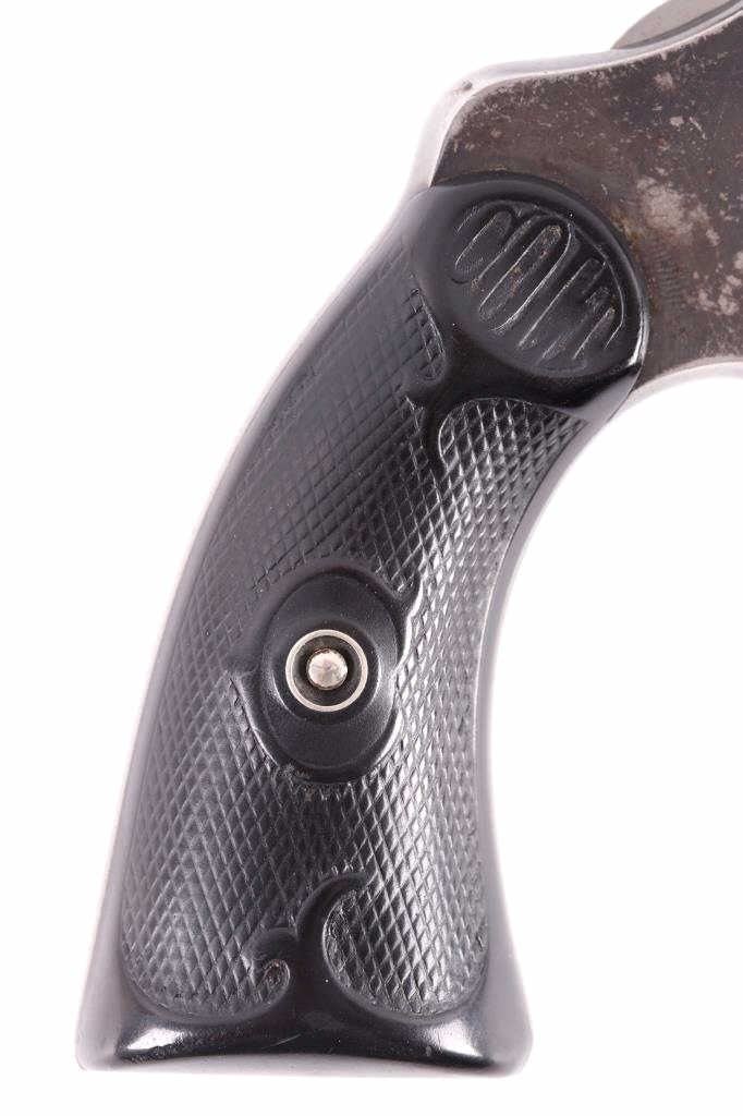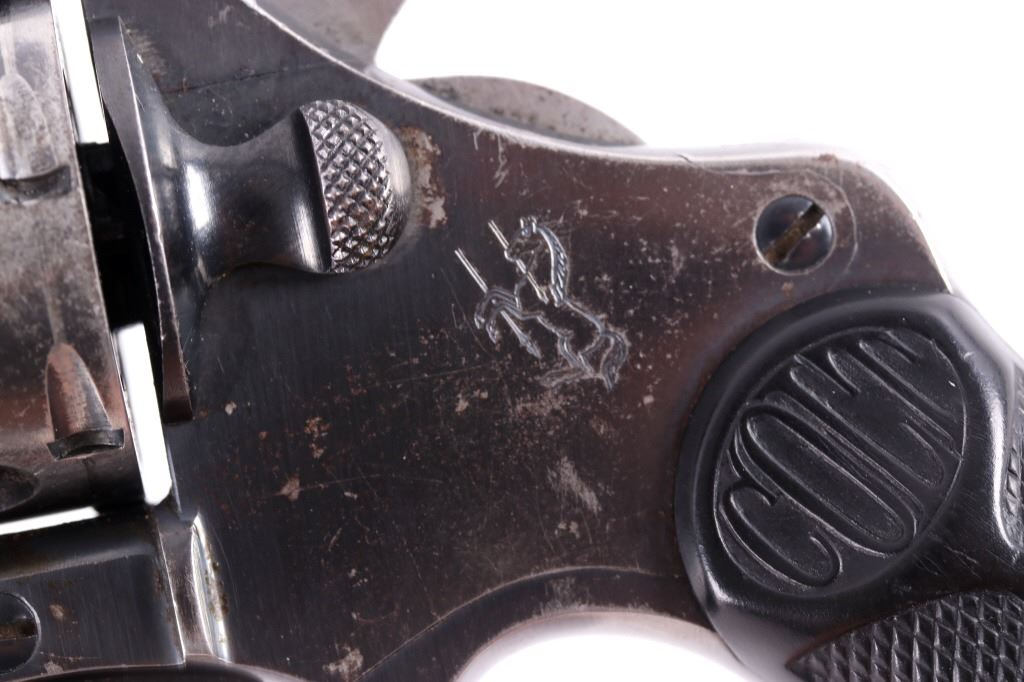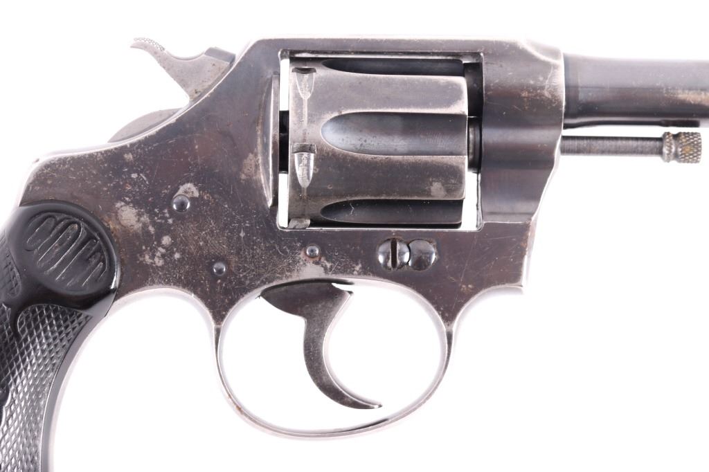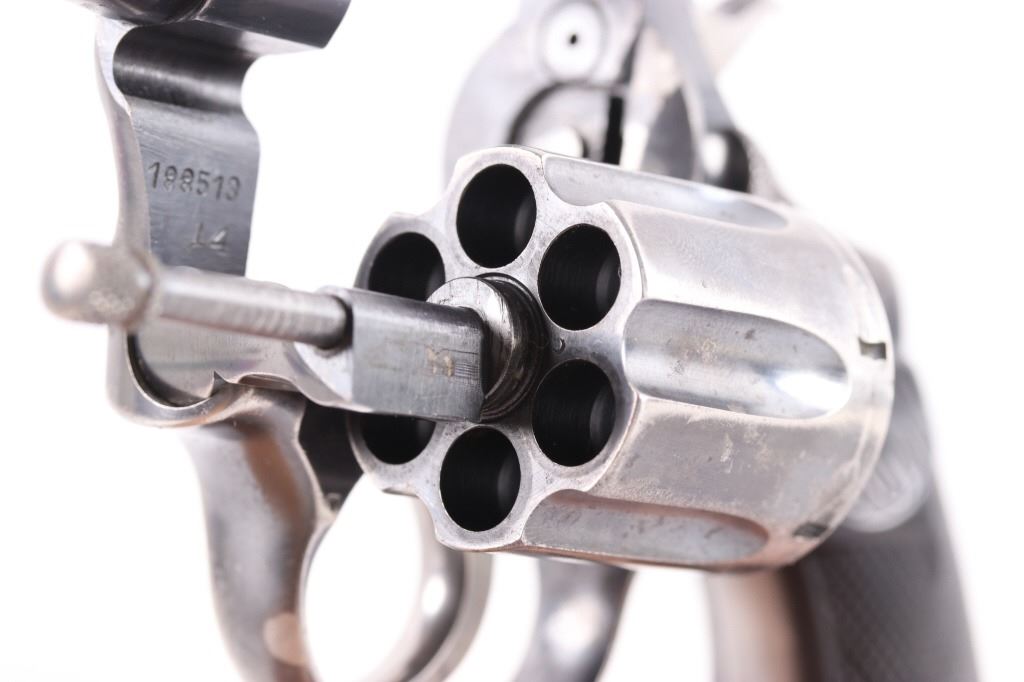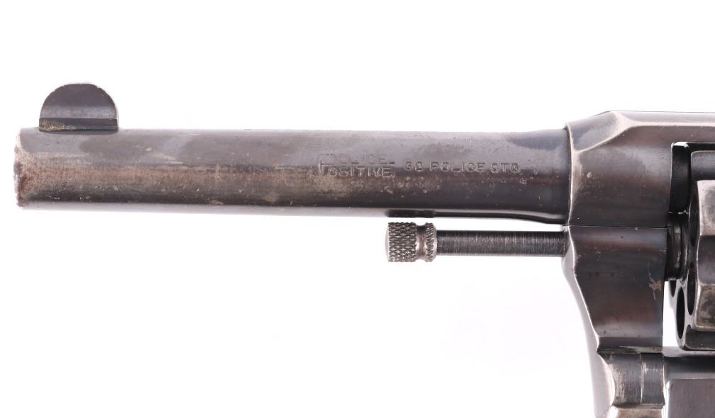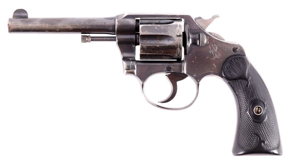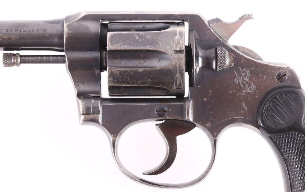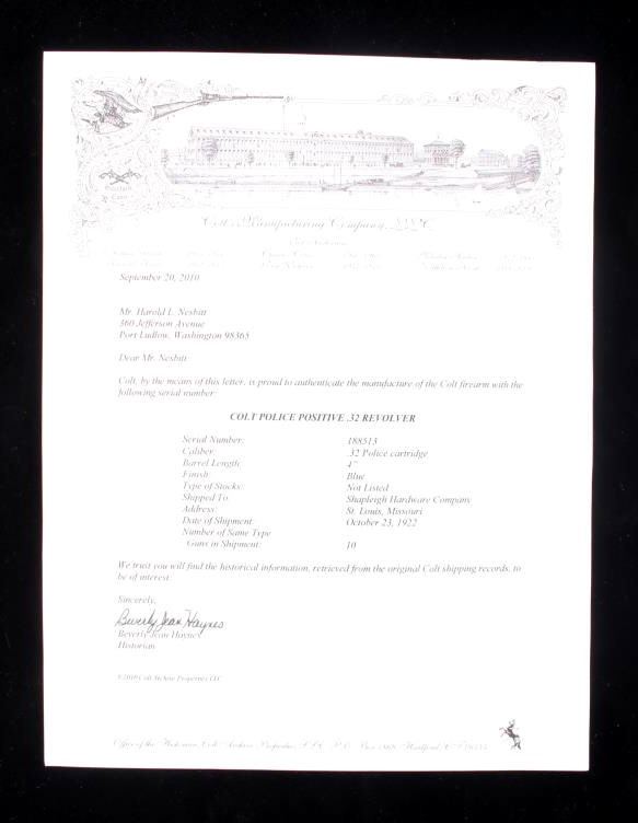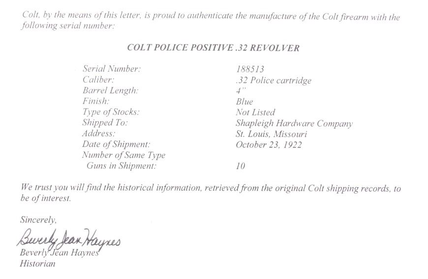 This lot offers you a Colt Police Positive revolver, chambered for .32 Police. The revolver is accompanied by a Colt Factory letter, dating the shipment of the firearm to October 23rd, 1922, and shipped to Shapleigh Hardware Company of St. Louis, Missouri. The pistol features checkered hard rubber (gutta-percha) COLT factory grips, contrasted by a high polish blue finish. The revolver is marked with three Colt logos, two oval "Colt" trademark logos - one on each grip, and a bucking Colt on the left side of the frame. The barrel of the pistol is marked "Police Positive Special .32 Police CTG", as well the top of the barrel is stamped "Colt's Pt. F.A. Mfg. Co. Hartford, CT. U.S.A. Pat'd Aug. 5, 1894 June 5, 1900 July 4, 1905". Swing open the cylinder with the checkered release, and you will expose the matching serial numbers. This is a Curio & Relic firearm and requires NICS background check, or FFL transfer. Serial Number: 188513