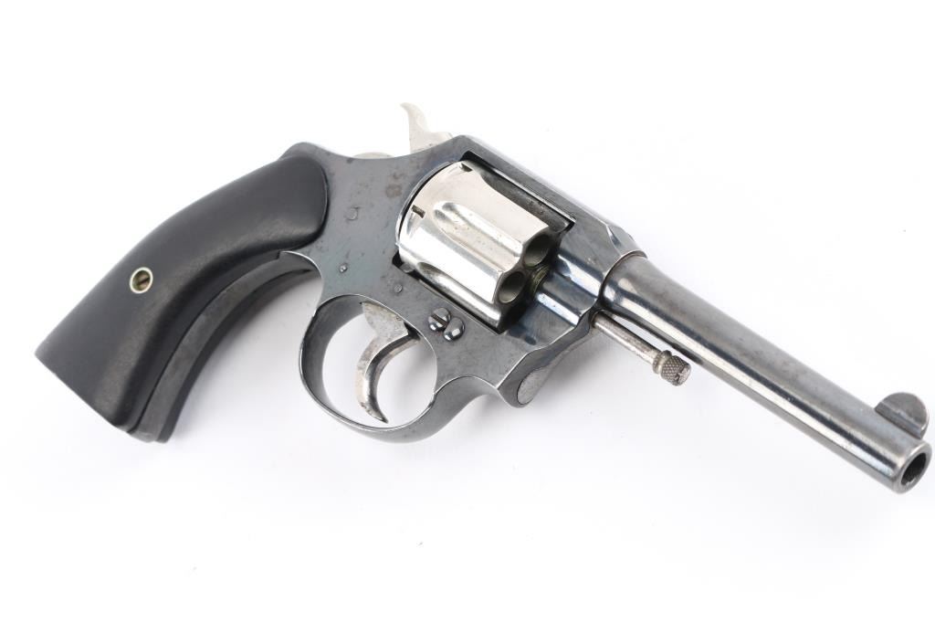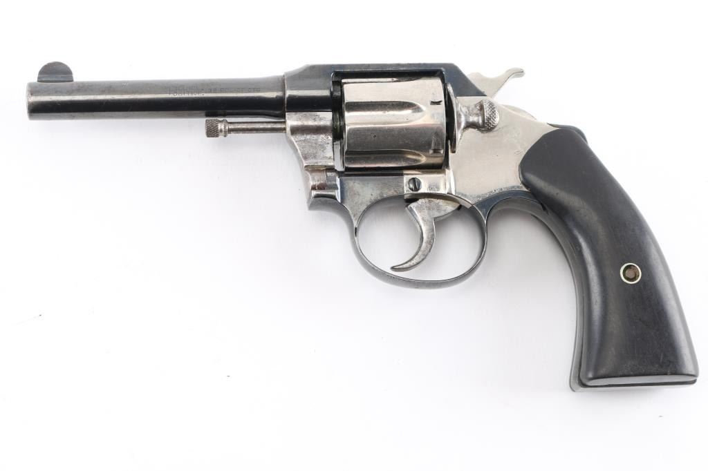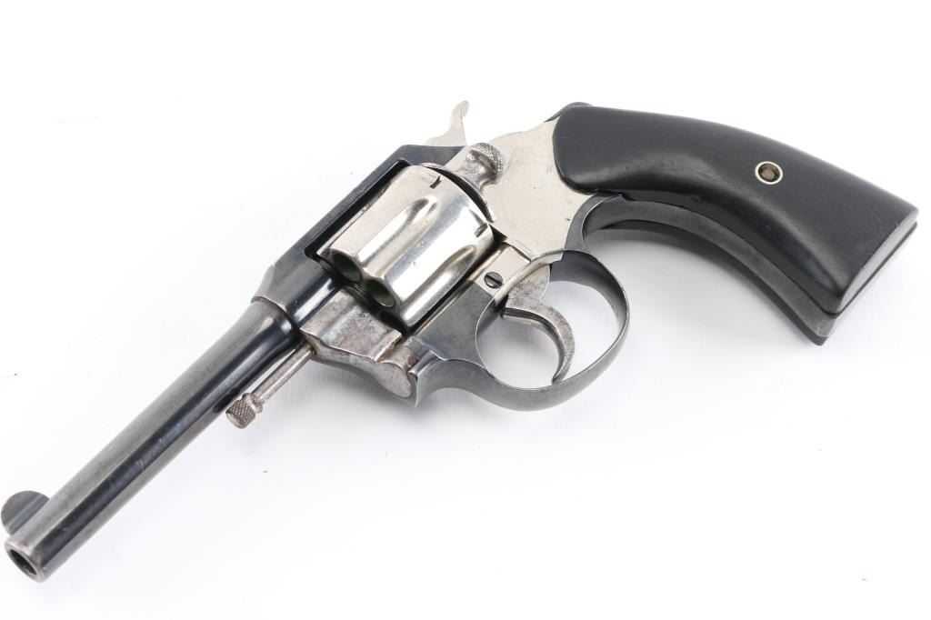 Double/single action revolver features two-tone nickel & blued finish, smooth non factory black wood grips, 4" barrel, fixed sights. Bore is good/bright, lightly pitted with strong rifling. Charge holes are very good. Revolver is blue with nickel finished cylinder, hammer, side plate, crane & trigger. The nickel parts nave been refinished giving the revolver a "Pinto" appearance. Blue is mostly there with some holster wear and scratches. Grips are very good. Action is smooth/crisp. Manufactured 1923.