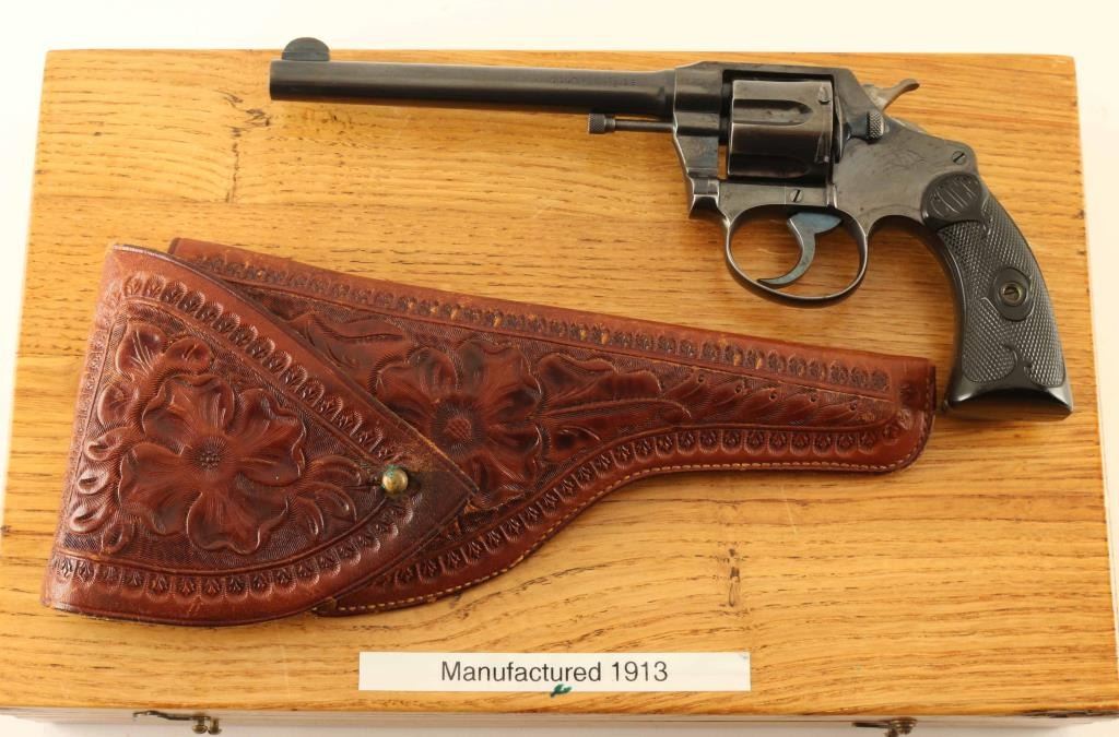 Vintage small frame double action revolver chambered for .38 Smith & Wesson or .38 Colt New Police, manufactured circa 1913. Features a blued finish, tapered 6" barrel, round blade front sight, 'u' notched rear sight, fluted six-shot cylinder, non-shrouded ejector rod, smooth trigger, knurled hammer spur and two-piece fancy checkered black hard rubber grips with "COLT" decor. Includes a tooled brown leather flap holster and a blue felt lined wood display case. Revolver exhibits approximately 70% of it's blued finish showing scattered handling marks/wear and some pin prick pitting. The barrel retains a higher percentage of finish than the rest of the revolver and may have been refinished. Action is crisp with solid lock-up, the bore shows scattered pitting, the markings are good and the hard rubber grips are very good. Condition is NRA Good. ***C&R Firearm***