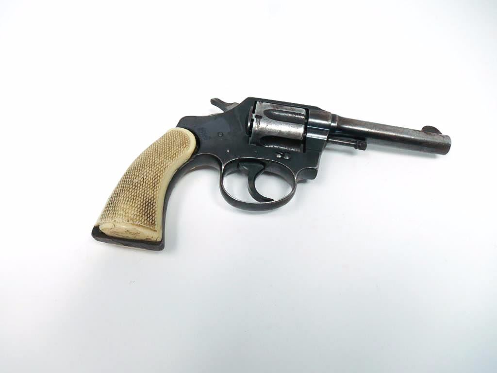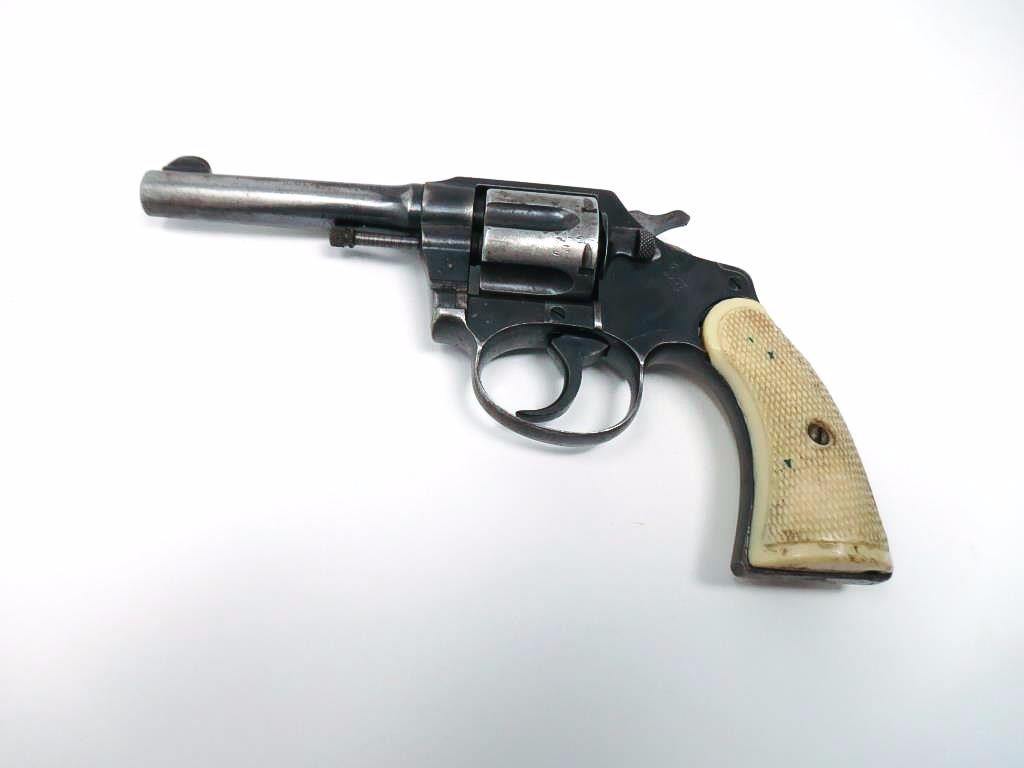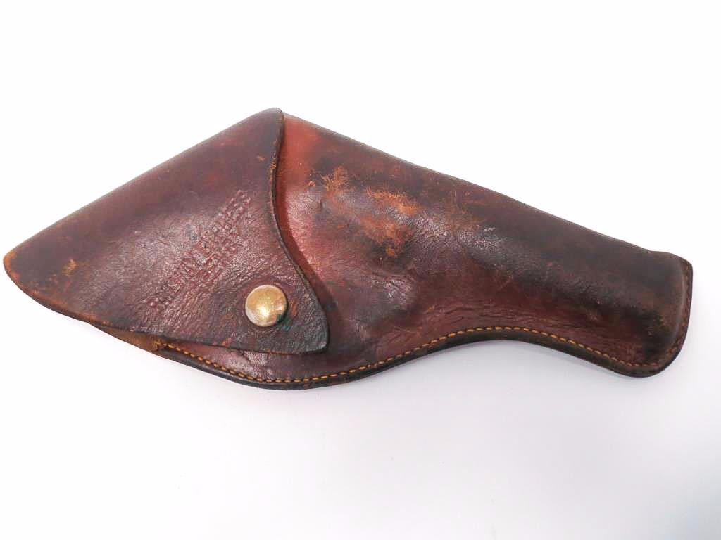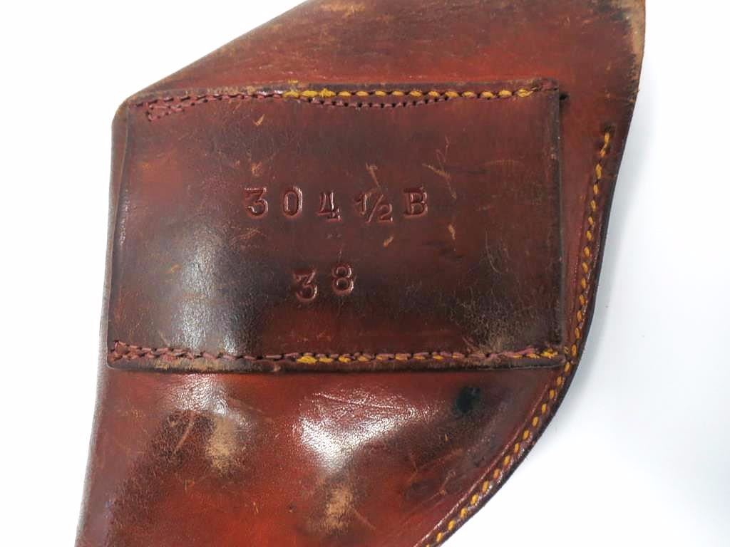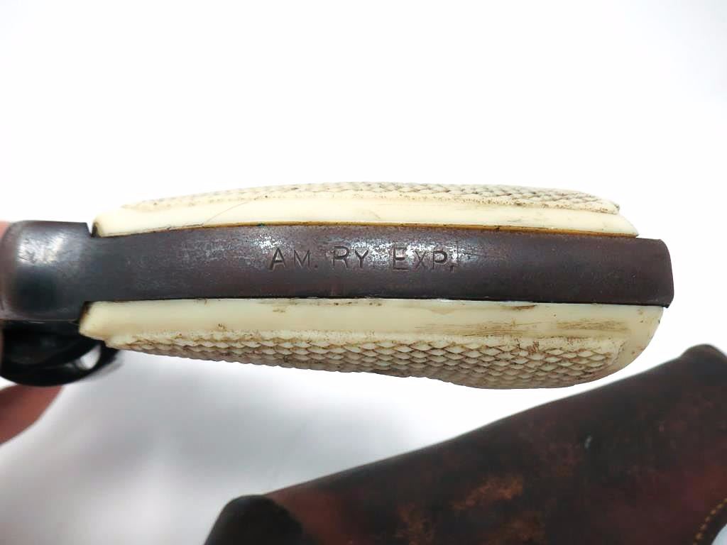 With "AM.RY.EXP." Factory stamped on the backstrap. White plastic grips. 4" barrel. About 70% blue. The revolver is in a "Railway Express" holster. Pistol and holster in fine condition.
