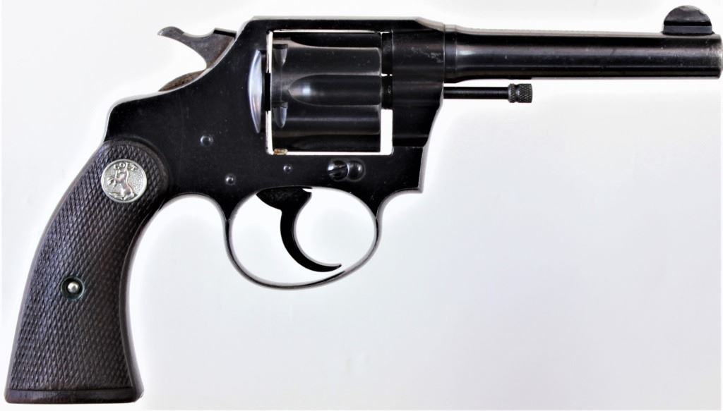 Colt Police Positive .38 cal. SN 175412 1st issue double action revolver with blued finish, 4" barrel, smooth top strap, square butt, walnut checkered grips. Made in 1926, a nice example the revolver shows approx. 75-80% original finish the loss on cylin1st issue double action revolver with blued finish, 4" barrel, smooth top strap, square butt, walnut checkered grips. Made in 1926, a nice example the revolver shows approx. 75-80% original finish the loss on cylinder hinge and releaseareas. Frame with some very light marks all markings sharp including Colt Hartford 2 line address ending in 1905 patent date. Grips are very good plus a little flattening to checkering, some darker on right side from natural oils of hand.The action functions perfectly, bore fine but needs a thorough cleaning from prolonged storage. De Accessioned from a state of AZ Museum. FFL / Modern. Est. 250-500